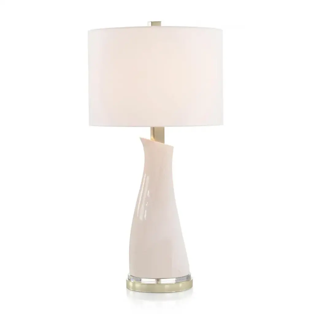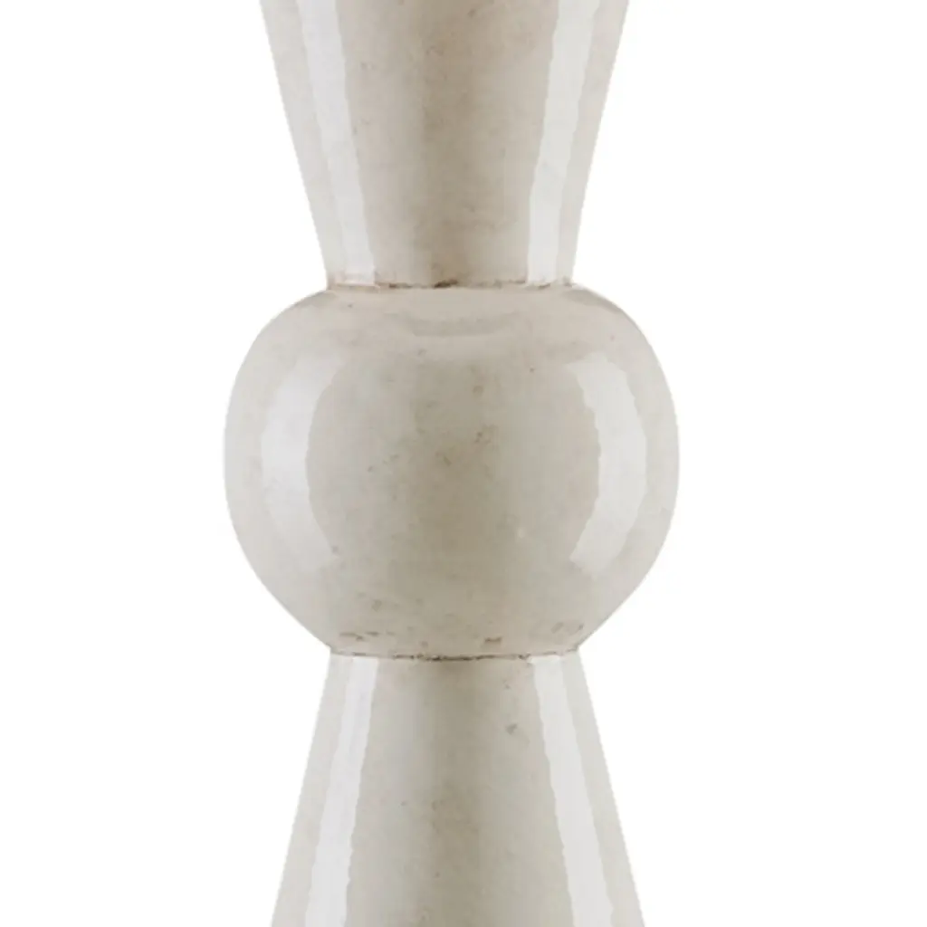 The Upbeat Table Lamp is mod in style. The shapely terracotta body features a center ball with cones extending up toward a linen shade and downward to its culmination. The shade is fastened with a wrought iron finial.