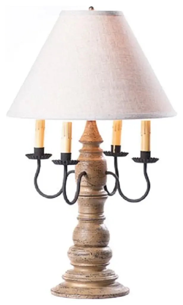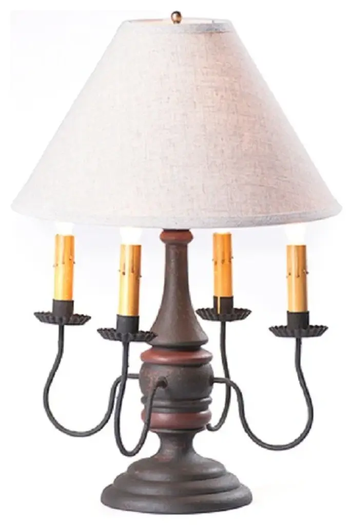 A larger version of our ever popular Cedar Creek Lamp, the Bradford Lamp is proportioned for a large room with overstuffed furniture or high ceilings. The Bradford Lamp is brimming with country charm. It offers another option for the country decorator.Four candelabra arms, 60 watts per socket maximum. One standard center socket, 150 watts maximum. Features a 3-way switch, allowing three lighting options. Just the arms, just the center or both. Textured body color with slight distressing. Textured black arms with crimped pans. Handcrafted in Pennsylvania. Includes a 17" Linen ShadeMeasures 28-Inches high and 17-Inches diameterHas a 7-foot cord and line switch; Plugs into wall outlet; Top center has a standard socket, 1 x 150 watts max; Arms have candelabra sockets, 4 x 60 watts maxBULBS NOT INCLUDEDUL listed for dry locationsTextured paint finish; Linen shade includedLamp Base is made in the USA, Shade is Imported