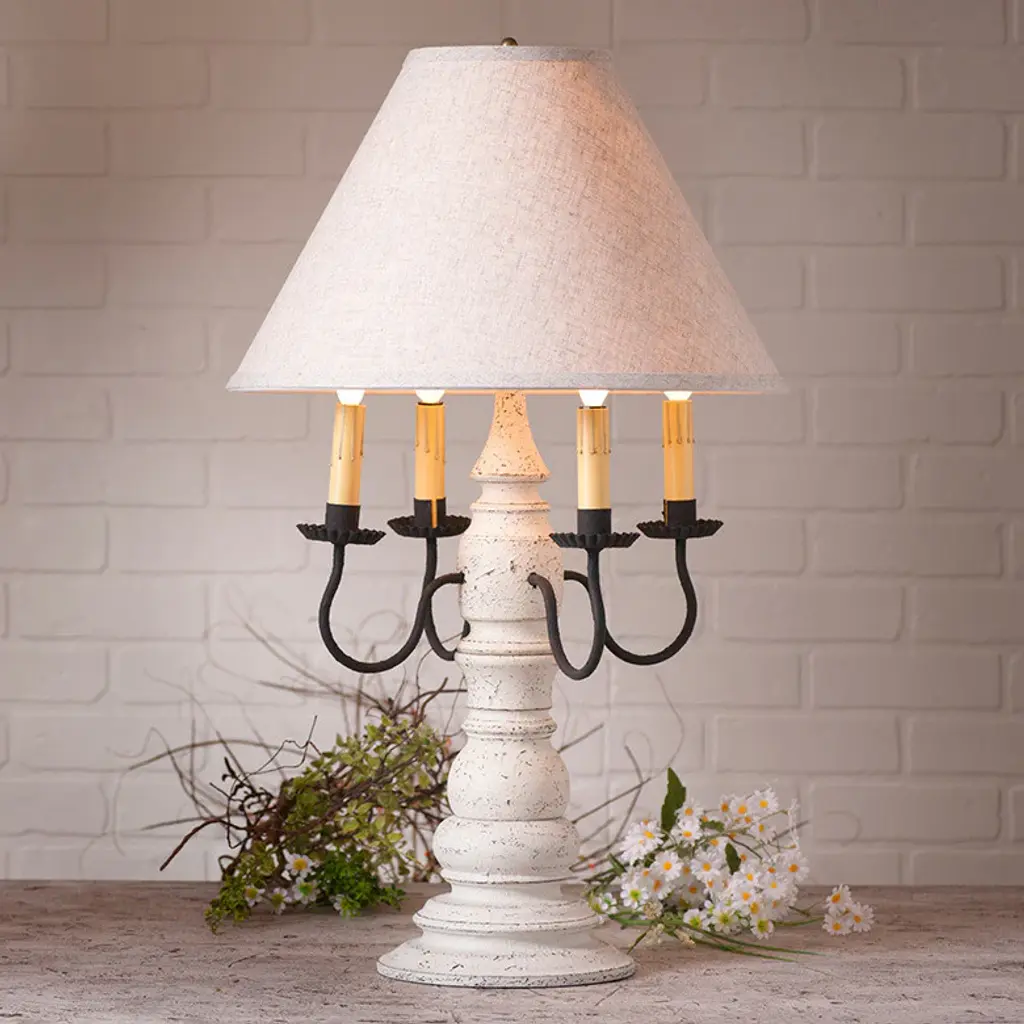 A larger version of our ever popular Cedar Creek Lamp, the Bradford Lamp is proportioned for a large room with overstuffed furniture or high ceilings. The Bradford Lamp is brimming with country charm. It offers another option for the country decorator.Four candelabra arms, 60 watts per socket maximum. One standard center socket, 150 watts maximum. Features a 3-way switch, allowing three lighting options. Just the arms, just the center or both. Textured body color with slight distressing. Textured black arms with crimped pans. Handcrafted in Pennsylvania. Includes a 17" Linen ShadeMeasures 28-Inches high and 17-Inches diameterHas a 7-foot cord and line switch; Plugs into wall outlet; Top center has a standard socket, 1 x 150 watts max; Arms have candelabra sockets, 4 x 60 watts maxBULBS NOT INCLUDEDUL listed for dry locationsTextured paint finish; Linen shade includedLamp Base is made in the USA, Shade is Imported