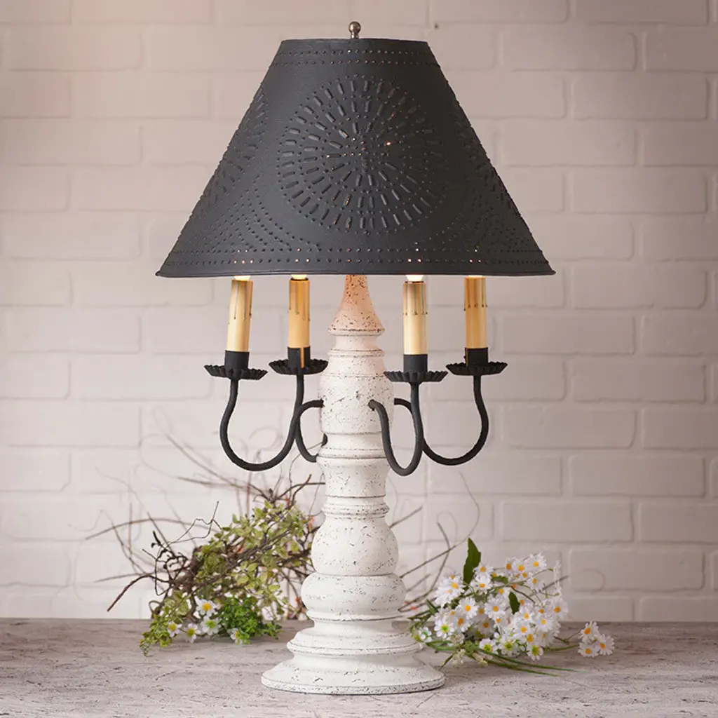 A larger version of our ever popular Cedar Creek Lamp, the Bradford Lamp is proportioned for a large room with overstuffed furniture or high ceilings. The Bradford Lamp is brimming with country charm. It offers another option for the country decorator.Four candelabra arms, 60 watts per socket maximum. One standard center socket, 150 watts maximum. Features a 3-way switch, allowing three lighting options. Just the arms, just the center or both. Textured body color with slight distressing. Textured black arms with crimped pans. Handcrafted in Pennsylvania. Includes a 17" Textured Black Flared Measures 28-Inches high and 17-Inches diameterHas a 7-foot cord and line switch; Plugs into wall outlet; Top center has a standard socket, 1 x 150 watts max; Arms have candelabra sockets, 4 x 60 watts maxBULBS NOT INCLUDEDUL listed for dry locationsTextured paint finish; Black textured shade includedLamp Base is made in the USA, Shade is Imported