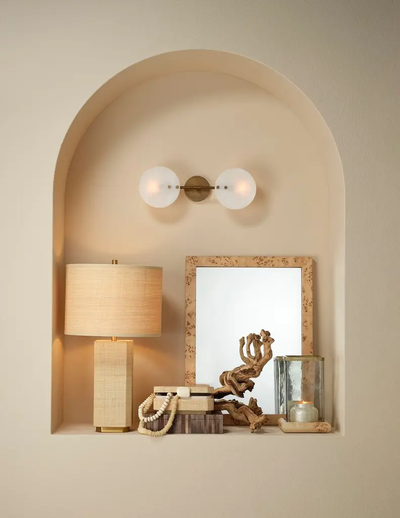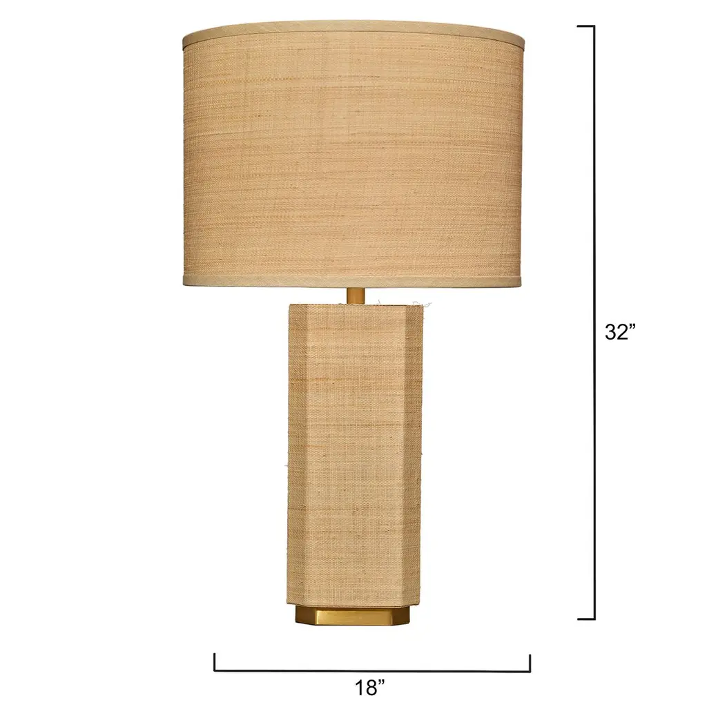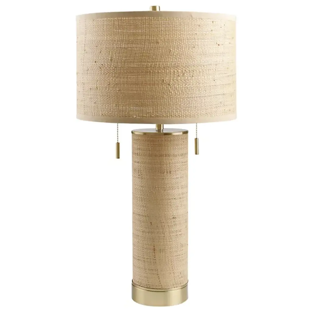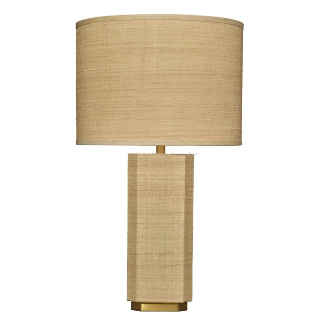 Effortlessly cool, this raffia wrapped marvel features an easy earth-toned palette and a simple geometric base. A raffia drum shade and splashes of softly burnished metal add a touch of luxe to this otherwise decidedly down to earth design that can enhance decors from Coastal Cowgirl to Urban Ranch.