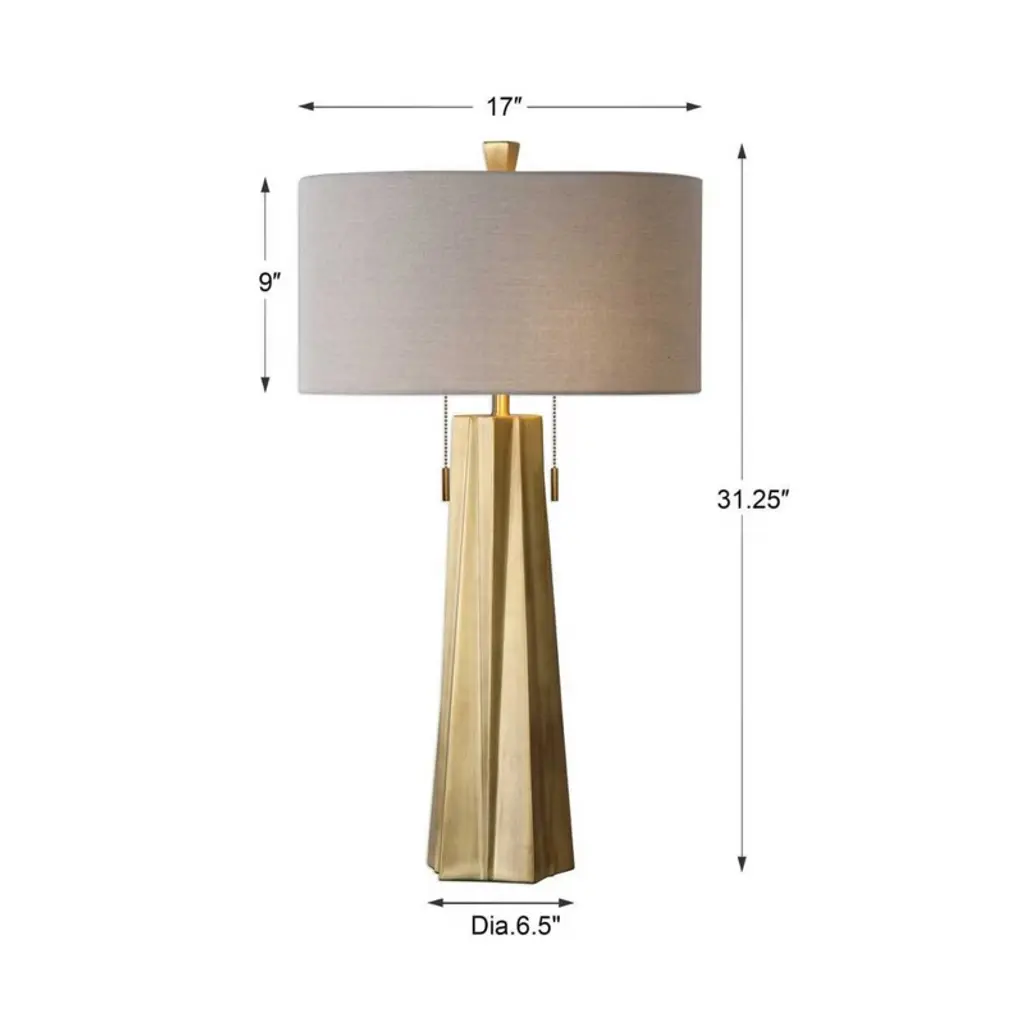 Infuse modern luxury into your interior with the Maris Table Lamp, a striking fusion of geometric form and timeless finish. The base is expertly crafted from shaped steel, molded into an inverted star pattern, and plated in a warm antiqued brass for a sophisticated metallic sheen. This luminous sculpture is topped with a round hardback drum shade in light gray-beige linen, creating a soft, neutral balance to the structured base. With its dual-bulb design and practical socket switch, the Maris Lamp delivers both ambient lighting and refined visual interest—perfect for living rooms, bedside tables, or upscale offices. Key Features: Sculptural steel base in an inverted star shape with antiqued brass platingRound gray-beige linen drum shade softens the lamp’s structured formDual E26 standard sockets with on-off socket switch for convenient controlIdeal for contemporary, transitional, or urban luxe interiorsDimensions: 31" H; Shade: 9" H x 17" Dia; Weight: 13 lbs This stunning table lamp is both an illuminating accent and a modern design centerpiece.