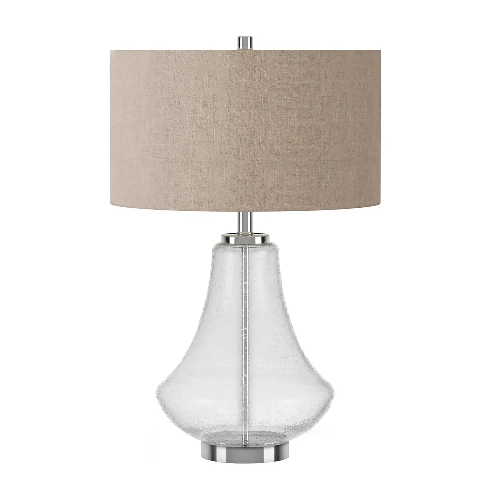 The Lenta White Table Lamp captures the natural beauty of birch tree bark with its artfully textured ceramic base. Finished in off-white with rust-colored accents, this lamp adds a touch of rustic charm while maintaining a refined elegance. The design is elevated with a clear crystal foot and brushed nickel details for a contemporary flair. A round hardback shade in light oatmeal linen with natural slubbing completes the look, offering warm, diffused lighting ideal for living rooms, bedrooms, or offices. Key Features: Birch bark-inspired ceramic base with off-white and rust-colored accents. Crystal foot and brushed nickel details for added sophistication. Round hardback shade crafted from oatmeal linen fabric. Equipped with 2 E26 (Standard) sockets, on-off chain switches, max 60W each. Dimensions: 30H, SHADE 9H X 19 Dia. (in); Weight: 14 lbs.