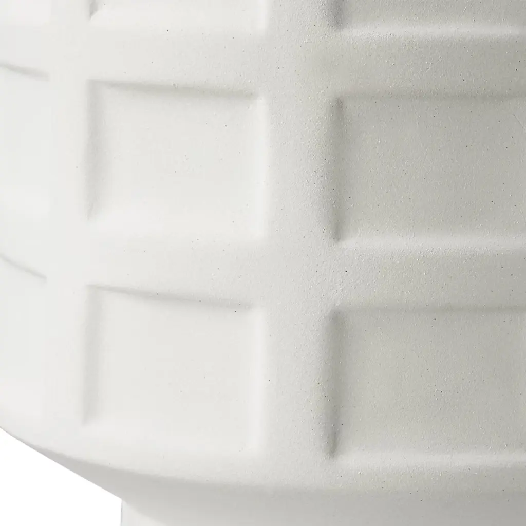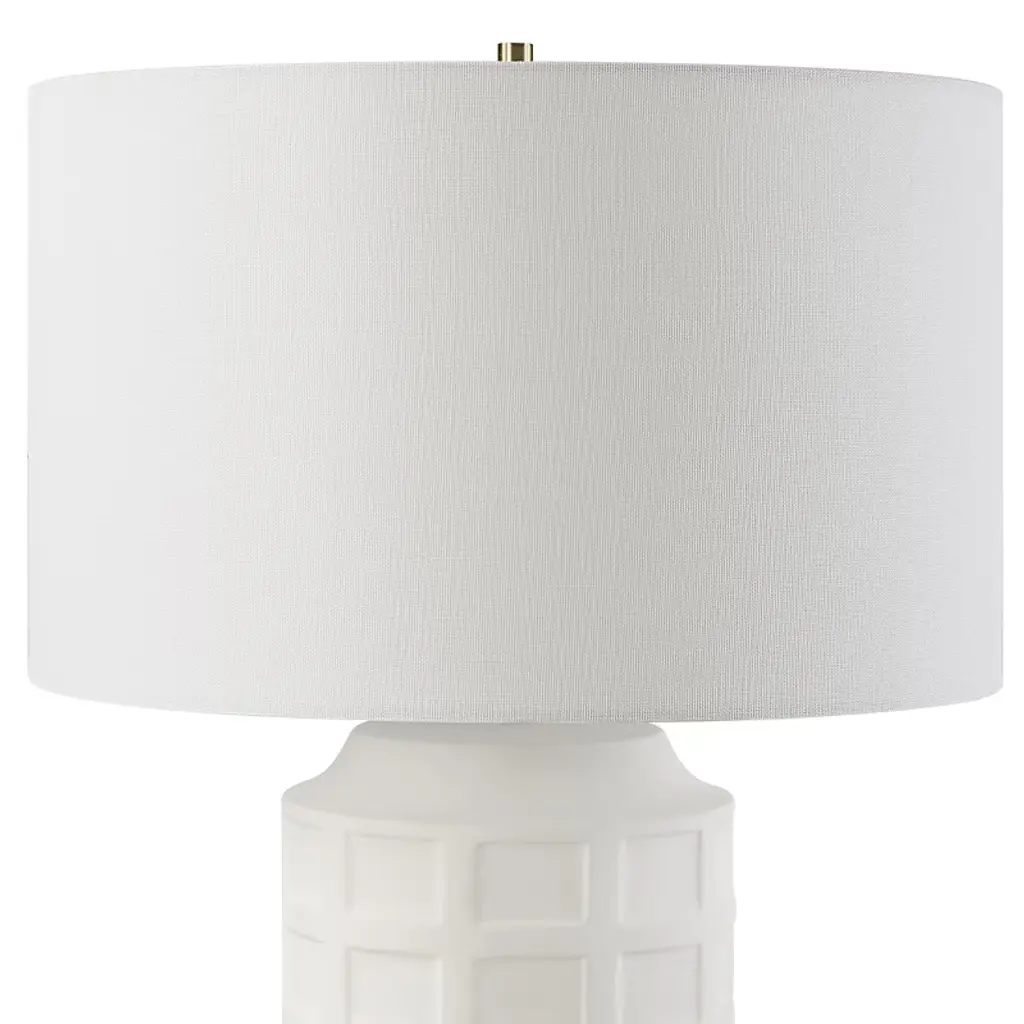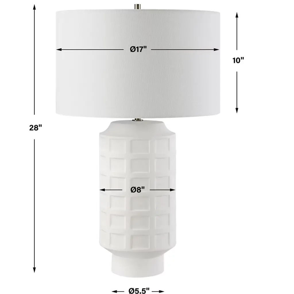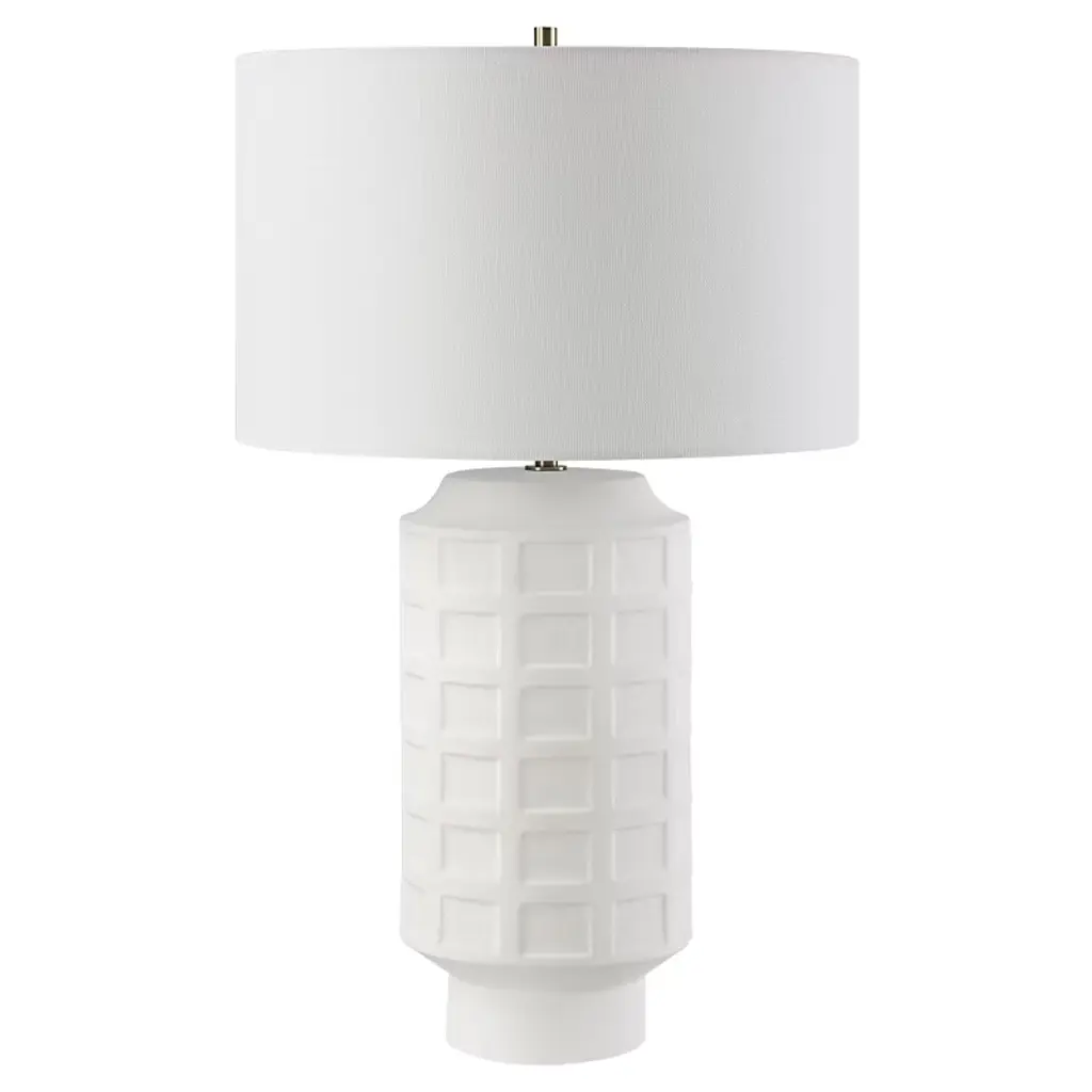 Elevate your space with the Window Pane White Table Lamp, a contemporary lighting accent that brings textural elegance and timeless simplicity. Crafted from ceramic, its repeating window pane tile pattern is finished in a crisp chalk white glaze for a clean, architectural look. Antique brass plated details at the neck and base introduce a warm metallic contrast, enhancing the lamp’s refined presence. Key Features: Chalk white ceramic base with embossed window pane design Accented with antique brass plated details for added warmth Includes round hardback white linen shade 3-way socket with E26 bulb base, 150W max Dimensions: 28 H; Shade: 10 H x 17 Dia. (in); Weight: 9 lbs