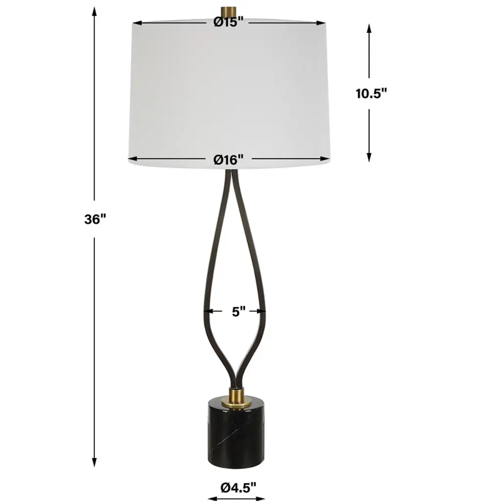 The Separate Paths Iron Table Lamp combines industrial strength with timeless elegance. Its tall wishbone-shaped iron base is finished in a rustic black, accented by antique brass plated details that bring warmth and contrast. A honed black marble foot grounds the design with a luxurious touch of natural stone. Topped with a slightly tapered round hardback shade in crisp white linen, this lamp delivers both functional illumination and a refined aesthetic. Key Features: Wishbone-shaped iron base in rustic black for a bold, industrial style. Antique brass plated accents create a warm, sophisticated look. Honed black marble foot adds luxurious stability and elegance. 3-way socket switch for versatile lighting with an E26 bulb. Dimensions: 36H, Shade 11H x 16 Dia. (in); Weight: 10 lbs.