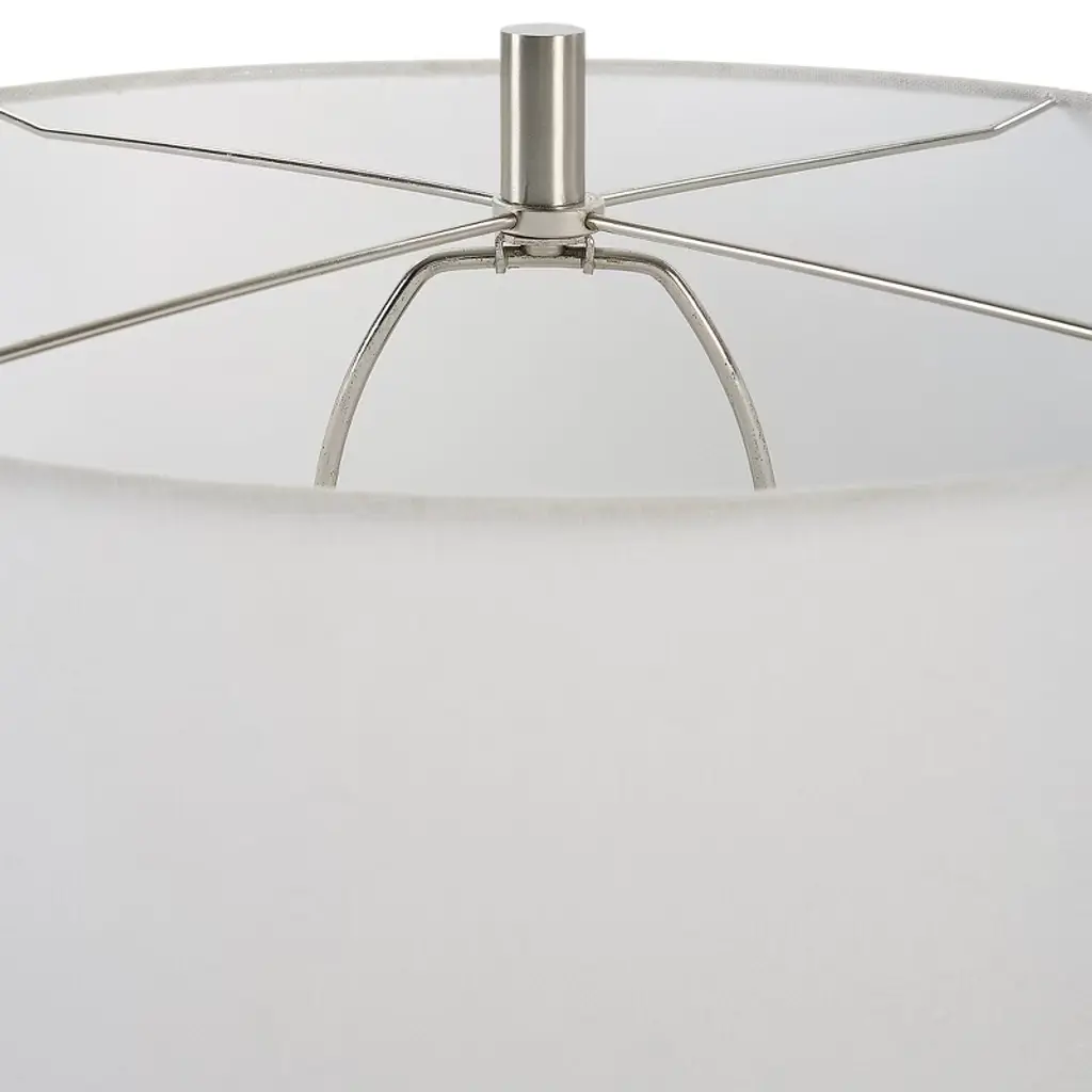 The Jubilee Sky Blue Table Lamp brings a serene, coastal-inspired charm to any space with its soft sky blue ceramic base enhanced by subtle cobalt mottled details. Accented with plated brushed nickel elements, this lamp is both contemporary and timeless. Its round hardback drum shade, crafted from crisp white linen fabric, diffuses light beautifully to create a warm and inviting ambiance. Due to the nature of fired glazes on ceramic lamps, each piece features slight variations, making every lamp truly unique. Key Features: Ceramic base with sky blue glaze and cobalt mottled detailing. Plated brushed nickel accents for a modern, polished look. Round hardback drum shade covered in crisp white linen fabric. 3-way socket switch for versatile lighting options. Dimensions: 27 H, Shade 10 H x 18 Dia. (in); Weight: 12 lbs.