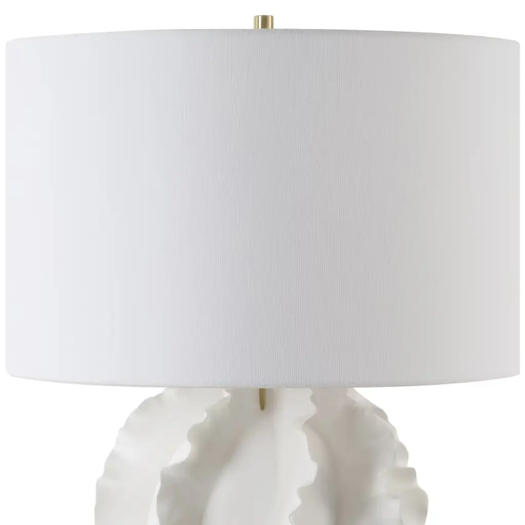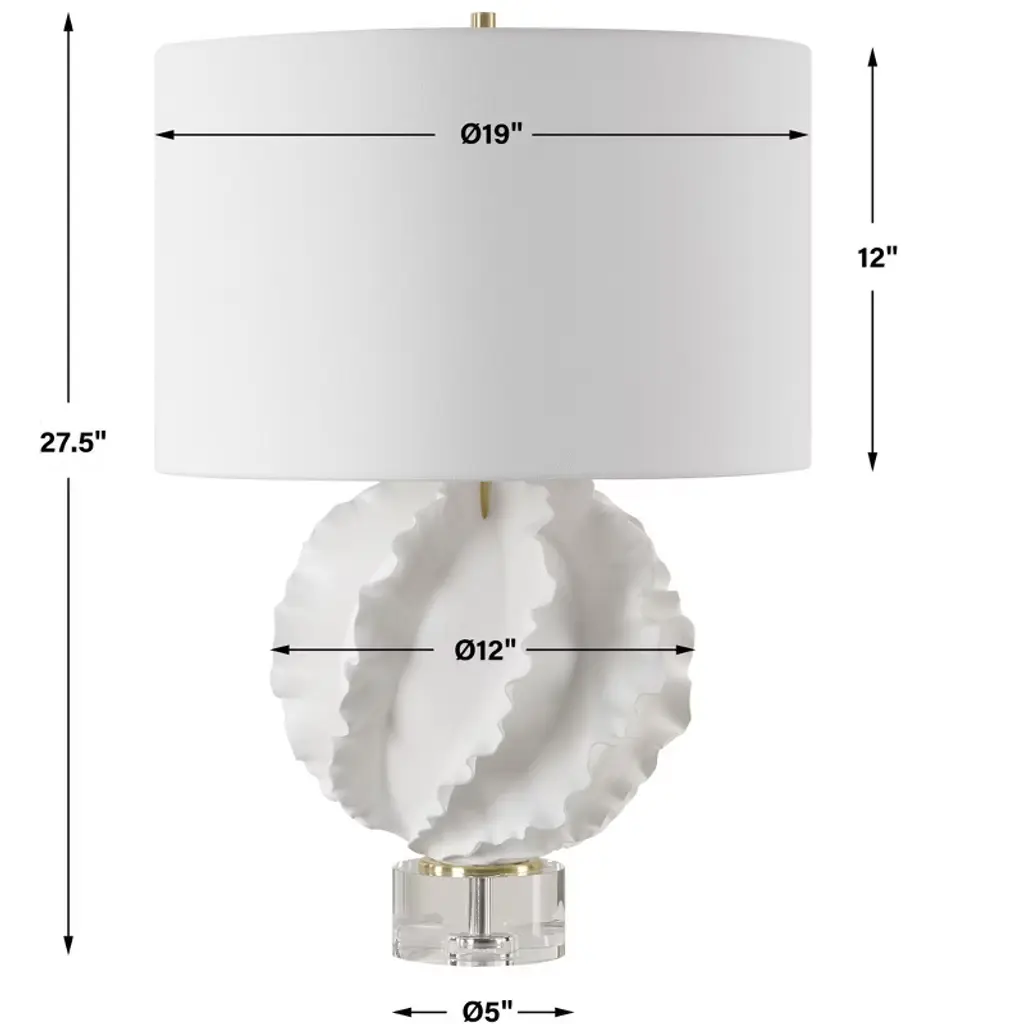 The Saylor White Table Lamp brings a refined touch of elegance to your interior spaces. Crafted from ceramic with a smooth satin white glaze, its gracefully flowing deep ridges create a striking visual texture. Accented with brass-plated details and elevated by a thick crystal foot, this lamp combines modern sophistication with timeless design. The round drum hardback shade, wrapped in crisp white linen, provides a clean and soft illumination, making it perfect for bedrooms, living rooms, or entryway consoles. Key Features: Ceramic base in satin white glaze with deep ridged texture. Brass-plated accents and thick crystal foot for a luxe finish. Includes a round hardback drum shade in white linen. E26 socket with 3-way switch, supports 150W max bulb (bulb not included). Dimensions – 28H, Shade: 12H x 19 Dia. (in), Weight – 24 lbs.