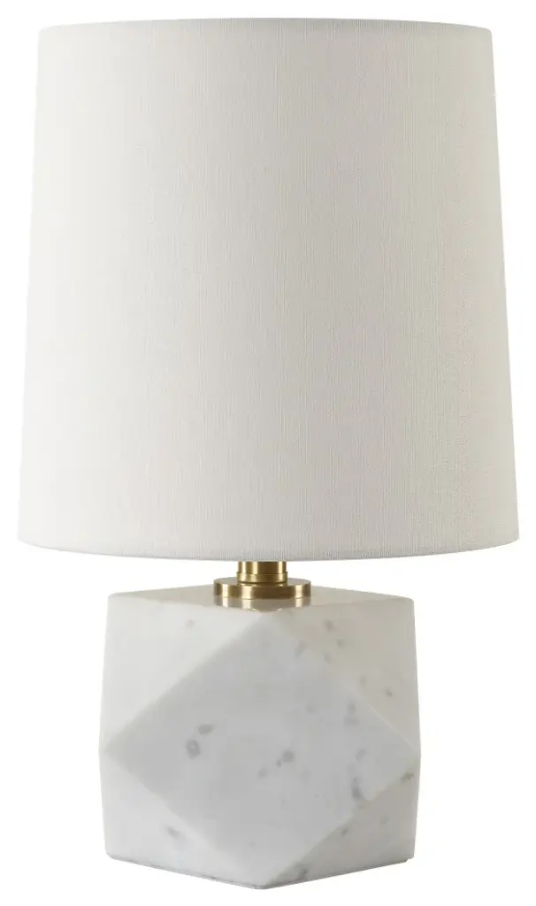 Featuring A Faceted Design, A Cut Above Table Lamp Is Crafted From White Marble With Subtle Veining And Accented With Plated Antique Brass Hardware. The Slightly Tapered Round Hardback Shade Is Covered In White Linen Fabric With Light Slubbing.