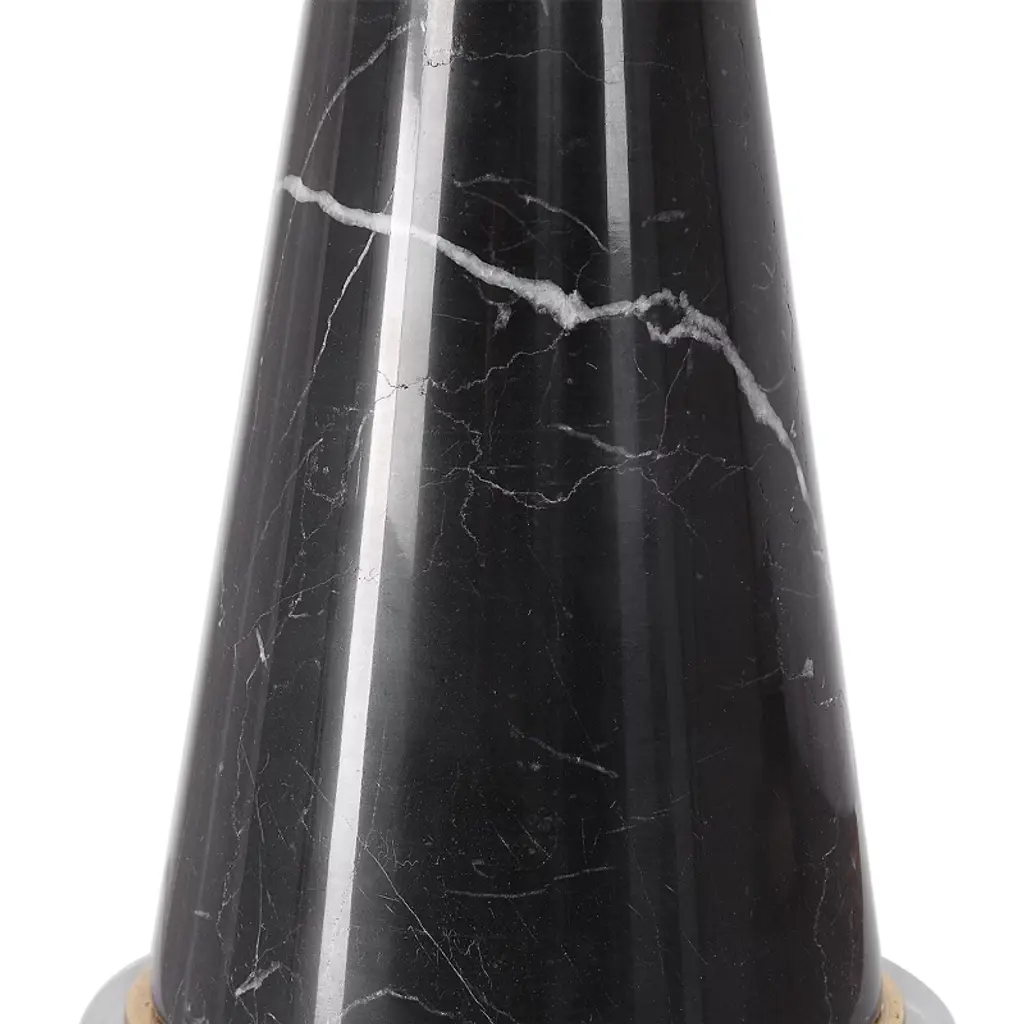 Elevate your interior with the refined luxury of the Uttermost Alastair Black Marble Table Lamp. Designed by Grace Feyock, this lamp showcases mid-century modern elegance through a sculptural hourglass-shaped base crafted from solid black marble. The base is beautifully accented with plated gold stainless steel and anchored by a thick crystal foot, combining durability with luxe detail. A beige linen oval hardback shade with vertical slubbing provides soft, diffused light that enhances any setting. Measuring 29.625" H × 16" W × 10" D, this lamp is ideal for contemporary bedrooms, stylish offices, or sophisticated living rooms. Compatible with 150W Type A bulbs and features a 3-way socket for lighting flexibility. Key Features: Material: Solid black marble, stainless steel, crystal, and linen fabric Color: Black base with gold accents and beige fabric shade Finish: Plated gold stainless steel with a crystal base for added elegance Dimensions: 29.625" Height × 16" Width × 10" Depth Shade: Oval hardback drum in beige linen with vertical slubbing Voltage & Bulb: 110V, supports 150W Type A bulb (not included), 3-way socket