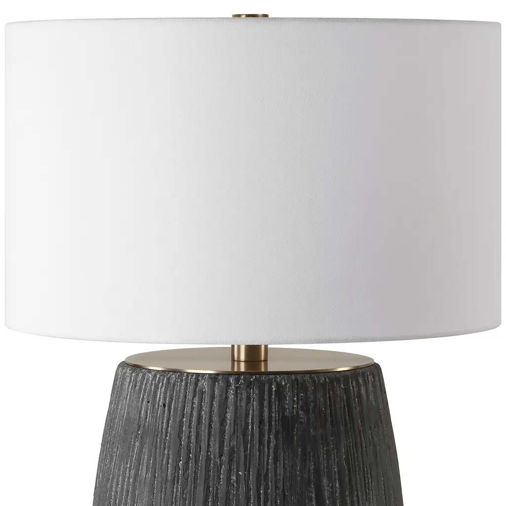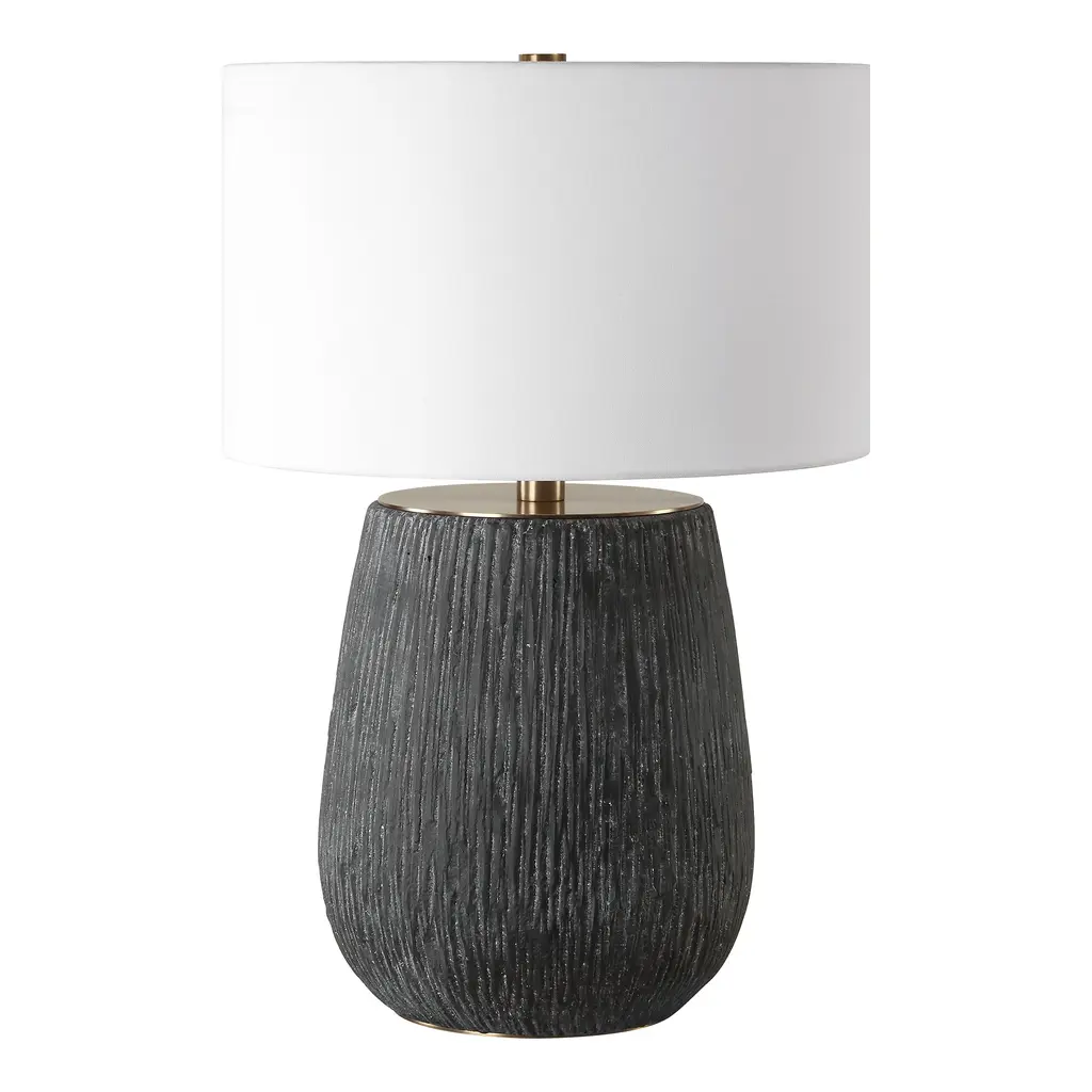 This table lamp features a concrete base with deep organic texturing finished in an aged black with light gray antiquing, accented with brass plated details. The round hardback drum shade is a casual white linen fabric.Uttermost's lamps combine premium quality materials with unique high-style design.With the advanced product engineering and packaging reinforcement, Uttermost maintains some of the lowest damage rates in the industry. Each product is designed, manufactured and packaged with shipping in mind. Features: Set include: One (1) Table Lamp Collection: Americana Designer: Matthew Williams Color: Aged black Material: Metal, Concrete Finish/Frame: Brass Shade: Round hardback shade Wattage: 150W Socket Type: 3-way Made in China No assembly required Dimensions: Dimensions: 20 inches deep x 20 inches wide x 29 inches high Item weight: 24 lbs This product will be shipped to you in one (1) box. Warning: This product can expose you to chemicals including nickel which is known to the State of California to cause cancer. For more information, go to www.P65Warnings.ca.gov/furniture.