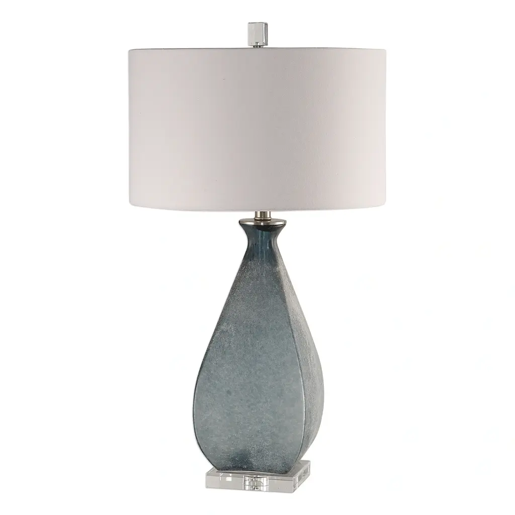 Uttermost's lamps combine premium quality materials with unique high-style design. With the advanced product engineering and packaging reinforcement, Uttermost maintains some of the lowest damage rates in the industry. Each product is designed, manufactured and packaged with shipping in mind. Deep ocean blue glass with an acid etched texture, accented with brushed nickel plated details and a thick crystal foot. The round hardback drum shade is a white linen fabric. Features: Set includes: One (1) table lamp Materials: Steel, Crystal, Glass and Linen Fabric Finish: Blue, Brushed Nickel Plated, Clear and White Special Features: Designer: Jim Parsons Voltage: 110 Number of lights: 1 Shade description: Round hardback drum Wattage: 150W Bulb quantity: 1 Bulb type: Type A Socket type: 3-way Dimensions: Table lamp dimensions: 28.75 inches high x 16 inches wide x 16 inches deep Shade dimensions: 16 inches top diameter x 16 inches bottom diameter x 9.5 inches high This product will ship to you in one (1) box. Accessories pictured are NOT included.