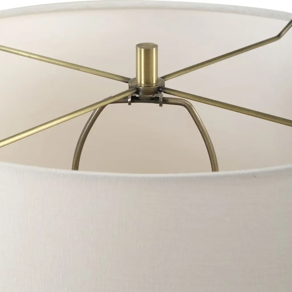 The Aubrey Travertine Table Lamp beautifully merges natural materials with timeless elegance. Its substantial base is crafted from honed travertine, offering rich texture and earthy tones that ground any interior. Thoughtfully detailed with plated antique brass hardware, it brings an understated luxe element to modern and classic spaces alike. Key Features: Natural travertine base brings earthy warmth and depth. Plated antique brass details enhance the elegant silhouette. Slightly tapered white linen shade diffuses soft, ambient light. 3-way socket switch offers adjustable brightness control. Dimensions: 25"H overall, Shade – 10"H x 16" Dia; Weight: 29 lbs