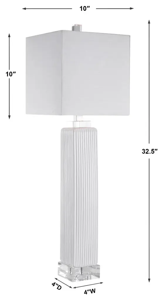 Showcasing A Refined Transitional Style, This Buffet Lamp Can Be Easily Placed With Its Square Ribbed Base Finished In A Gloss White Glaze, Paired With Thick Crystal Details And Brushed Nickel Accents. The Square Hardback Shade Is An Off-white Linen Fabric With Natural Slubbing. Uttermost''s Lamps Combine Premium Quality Materials With Unique High-style Design. With The Advanced Product Engineering And Packaging Reinforcement, Uttermost Maintains Some Of The Lowest Damage Rates In The Industry. Each Product Is Designed, Manufactured And Packaged With Shipping In Mind. DimensionsDepth: 10 in. Width: 10 in. Height: 32. 5 in.