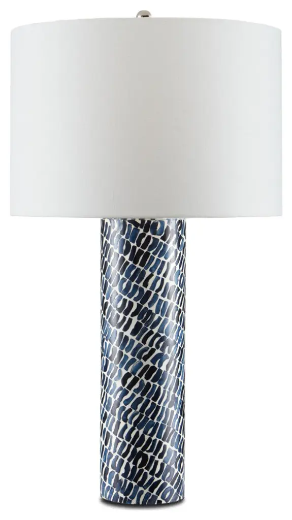The Bixby Blue Table Lamp blends coastal charm with refined elegance, making it a striking accent for any space. Its heavily textured ceramic base features a rich blue glaze, complemented by plated antique brass details for a touch of sophistication. A crisp white linen drum shade softens the lighting, creating a warm and inviting ambiance. Due to the unique nature of fired glazes, each lamp displays slight variations, ensuring every piece is one-of-a-kind. Perfect for bedrooms, living rooms, or coastal-themed décor, this lamp adds both style and function. Key Features: Textured ceramic base with rich blue glaze. Antique brass-plated accents for a refined look. White linen drum shade for soft light diffusion. E26 bulb socket with 150W wattage and 3-way switch. Dimensions: 29 H, Shade 10 H x 17 Dia. (in); weight – 15 lbs.