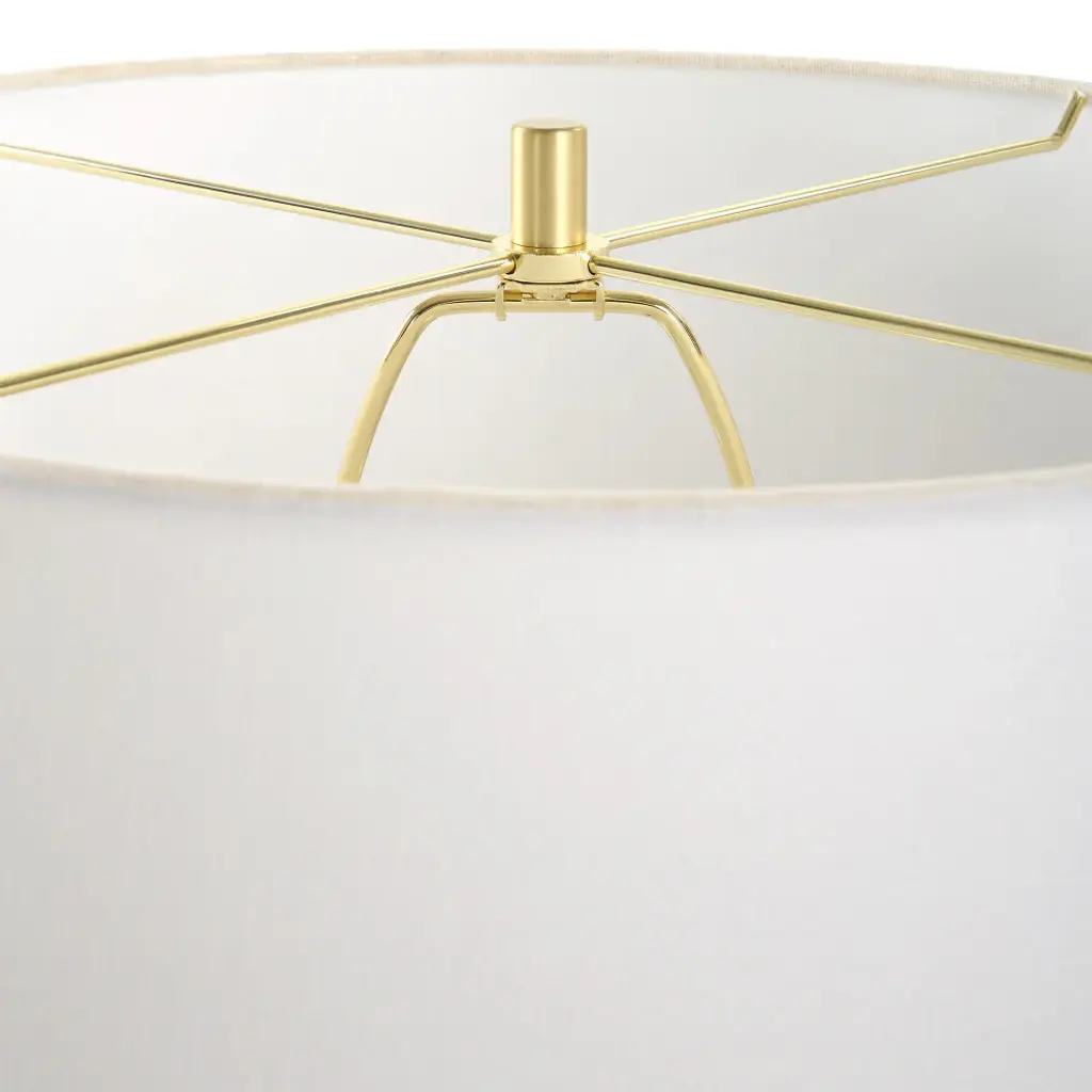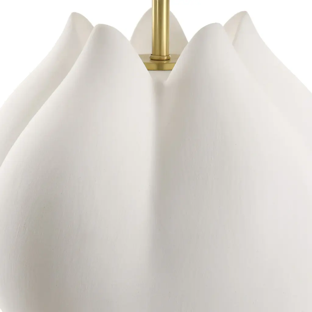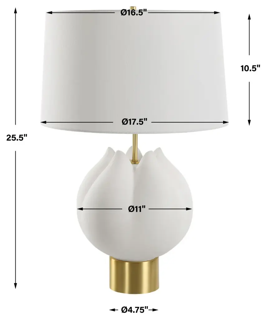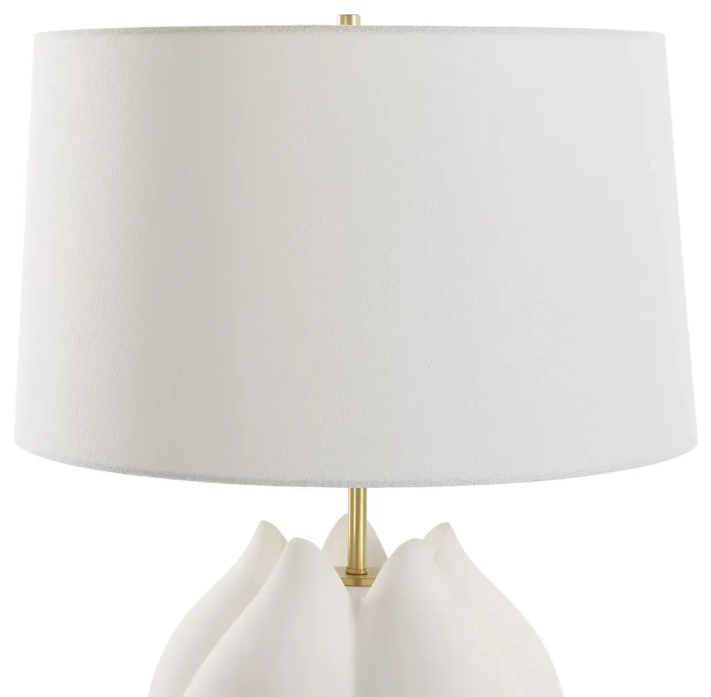 Inspired By Budding Flowers, The In Bloom Table Lamp Features A Porcelain Body With Subtle Texture, Finished In A Chalk White Glaze Paired With Lightly Antiqued Brass Plated Details. The Tapered Round Hardback Shade Completes The Piece In A Casual White Linen Fabric.