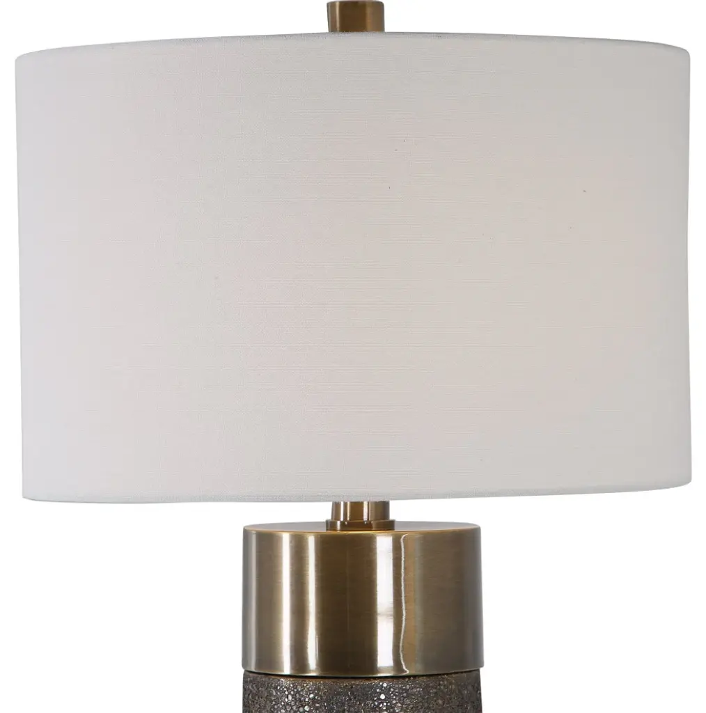 This Contemporary Table Lamp Design Showcases A Heavily Textured Ceramic Base That Is Finished In A Metallic Golden Bronze, Paired With Antique Brass Plated Iron Details. A Hardback Drum Shade In An Off-white Linen Fabric Completes This Piece. Uttermost''s Lamps Combine Premium Quality Materials With Unique High-style Design. With The Advanced Product Engineering And Packaging Reinforcement, Uttermost Maintains Some Of The Lowest Damage Rates In The Industry. Each Product Is Designed, Manufactured And Packaged With Shipping In Mind. DimensionsDepth: 17 in. Width: 17 in. Height: 31. 5 in.