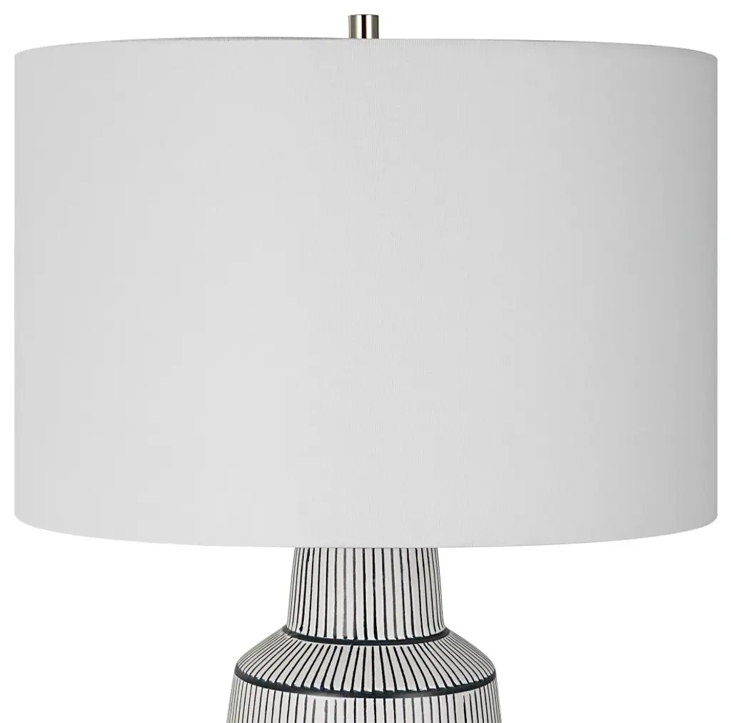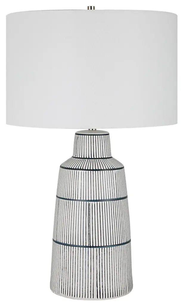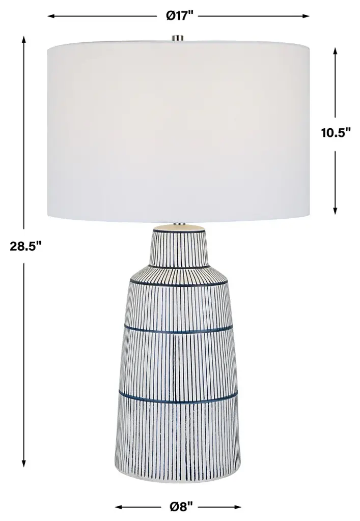 Inspired By The Classic Nautical Stripe Knit, This Ceramic Table Lamp Sports A Satin White Glaze With Rich Navy Blue Stripes And Polished Nickel Plated Accents. The Hardback Drum Shade Is Covered In A Crisp White Linen Fabric. Uttermost''s Lamps Combine Premium Quality Materials With Unique High-style Design. With The Advanced Product Engineering And Packaging Reinforcement, Uttermost Maintains Some Of The Lowest Damage Rates In The Industry. Each Product Is Designed, Manufactured And Packaged With Shipping In Mind. DimensionsDepth: 17 in. Width: 17 in. Height: 28. 5 in.