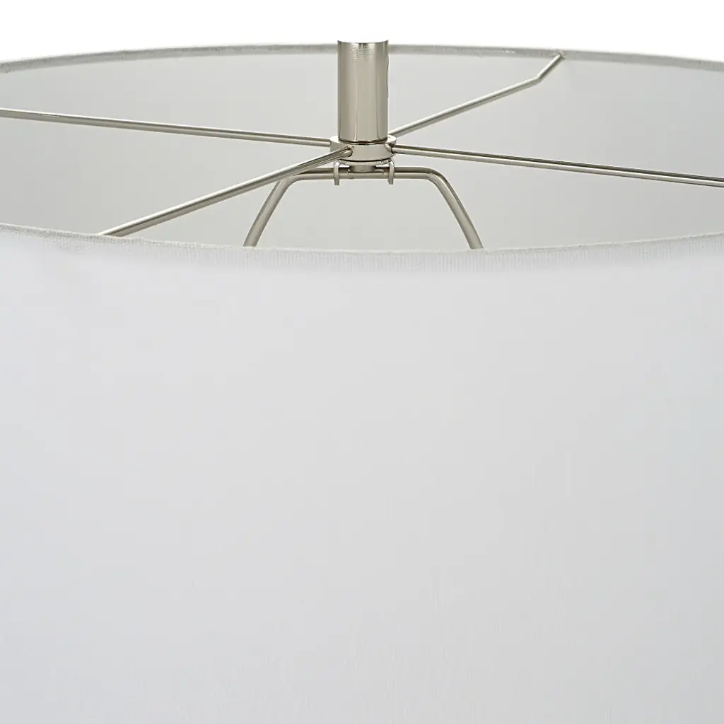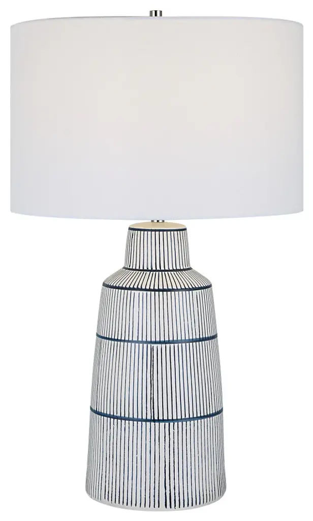 Inspired By The Classic Nautical Stripe Knit, This Ceramic Table Lamp Sports A Satin White Glaze With Rich Navy Blue Stripes And Polished Nickel Plated Accents. The Hardback Drum Shade Is Covered In A Crisp White Linen Fabric.