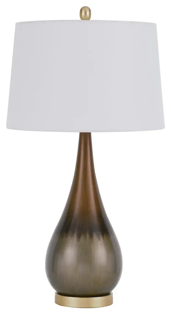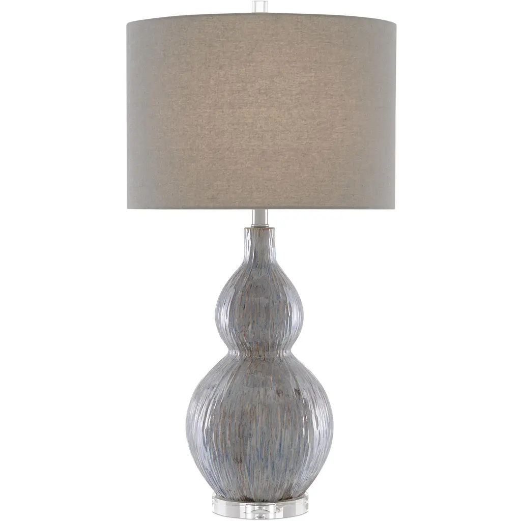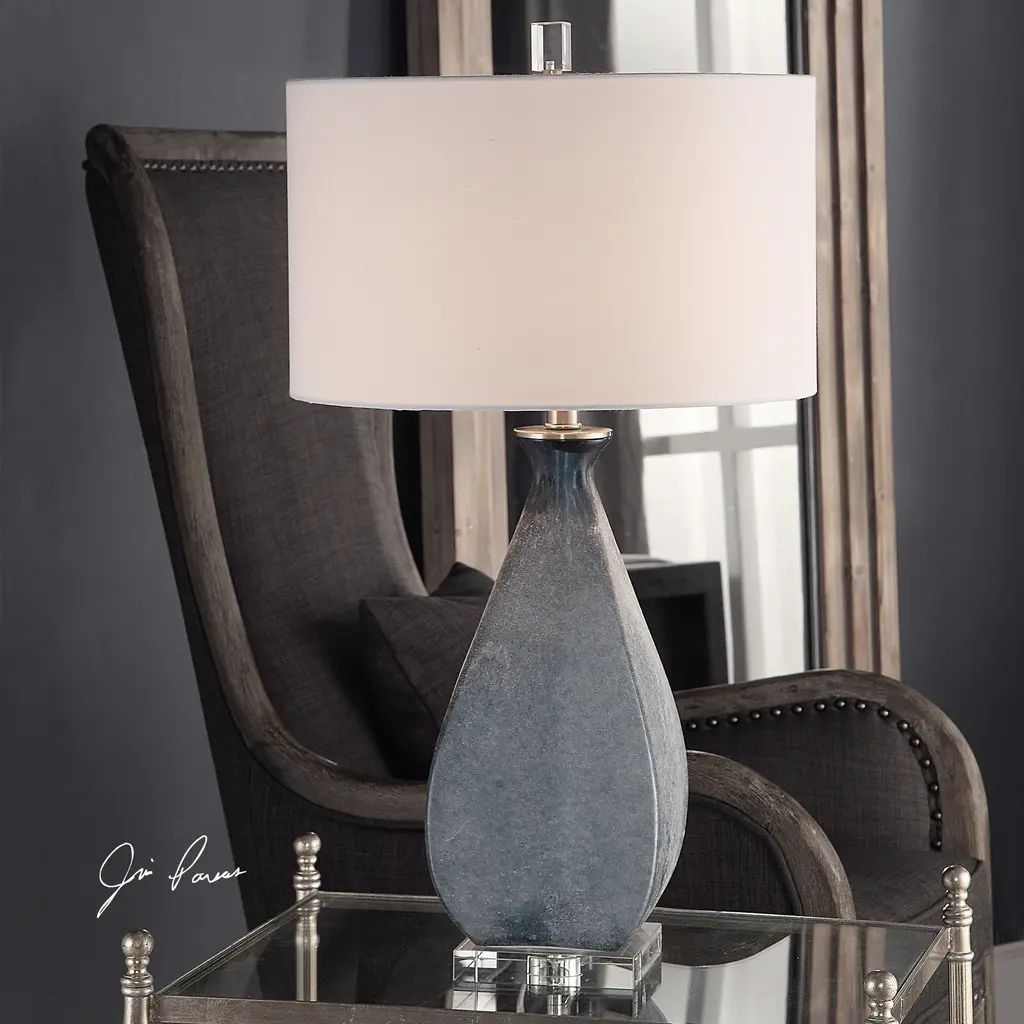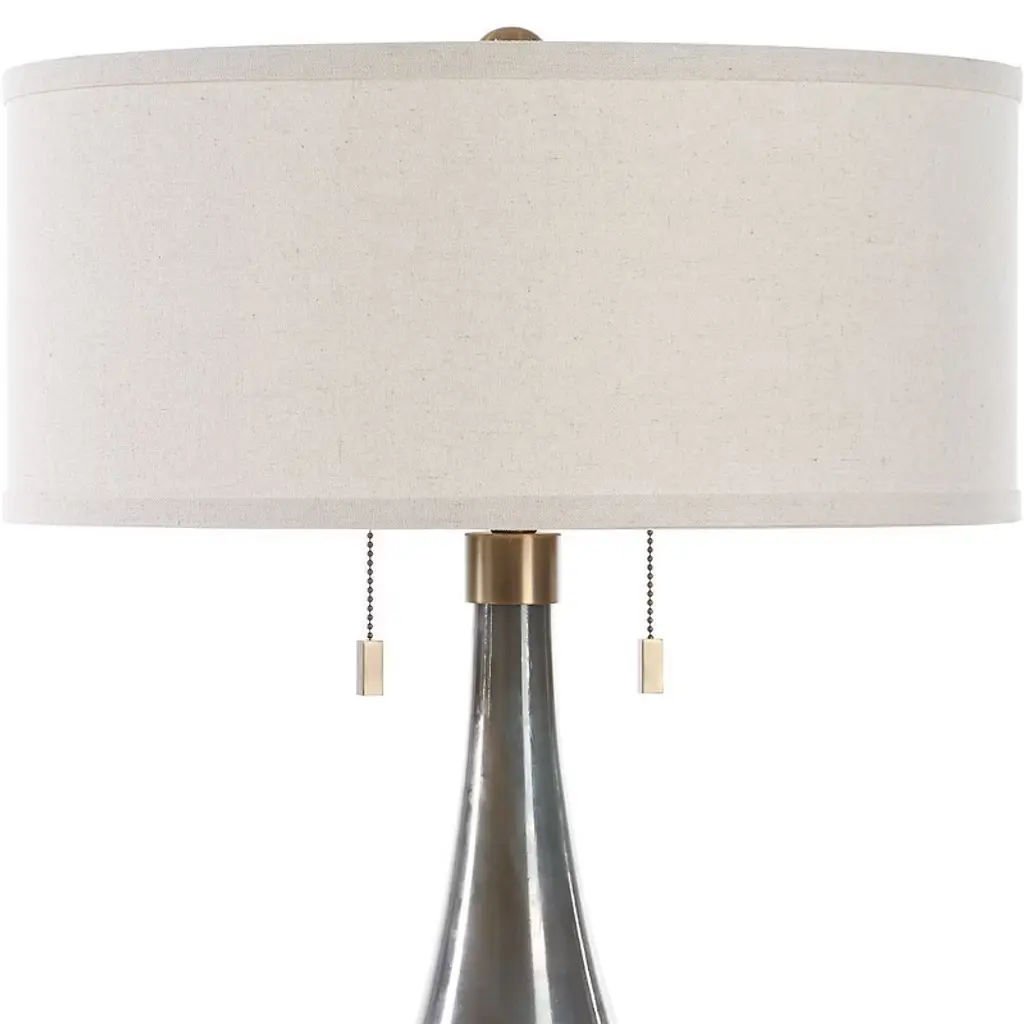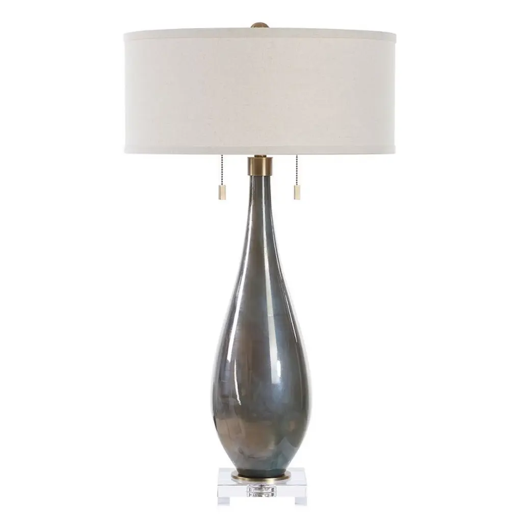 Elevate your lighting with the Cardoni Smoke Table Lamp — a refined fusion of muted elegance and bold metallic detail. Featuring a smoke gray glass body infused with subtle iridescent bronze hues, this lamp exudes quiet sophistication. Accents of plated brushed brass and a thick crystal base add polish and weight, anchoring the lamp with modern glamour. Topped with a white linen hardback drum shade with natural slubbing, it provides a soft, diffused glow that enhances any setting. Key Features: Smoke gray glass body with bronze iridescence adds moody sophistication Brushed brass metal details and crystal base lend elegance and stability White linen drum shade with natural slubbing creates a soft, diffused glow Dual E26 standard sockets with chain switch for practical lighting control Dimensions: 32" H; Shade: 8" H x 18" Dia.; Weight: 16 lbs