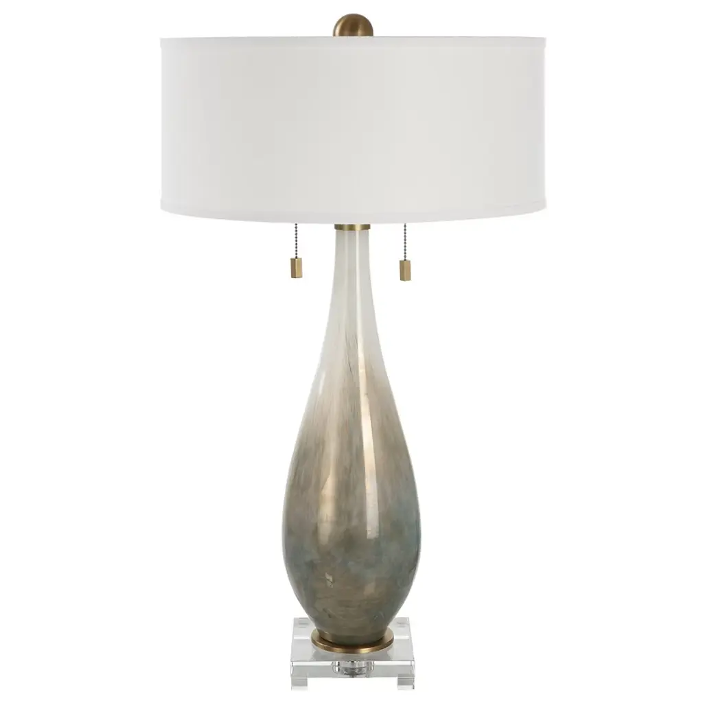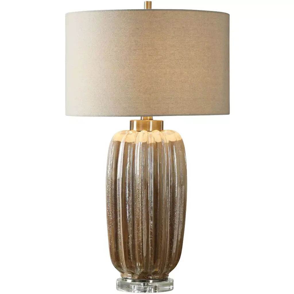 Two Light Table Lamp from Cardoni collection in Brushed Brass finish. Number of Bulbs 2. Max Wattage 60.00 . No bulbs included. Gloss White Glass Featuring Metallic Golden Bronze Hues Accented With Plated Brushed Brass Metal Details And A Thick Crystal Foot. The Round Hardback Drum Shade Is A Taupe Bronze Linen Fabric With Natural Slubbing. No UL Availability at this time.