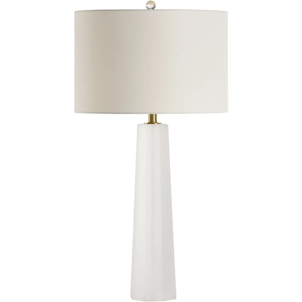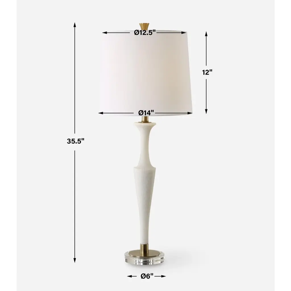 The Colette White Stone Table Lamp exudes timeless elegance and modern sophistication. Its base is crafted from ivory man-made stone, skillfully replicating the pristine beauty of Thassos marble, and is enhanced with plated antique brass details for a warm, luxurious touch. Resting on a crystal foot, this lamp showcases refined craftsmanship and an upscale aesthetic. The tapered round hardback shade, made of white linen fabric, diffuses light softly, creating a serene ambiance that complements both contemporary and classic interiors. Key Features: Ivory man-made stone base mimicking Thassos marble elegance. Plated antique brass accents add refined metallic warmth. Tapered round hardback shade in white linen fabric. Crystal foot for a luxurious and polished finish. Dimensions – 36H, Shade 12H x 14 Dia. (in), Weight – 15 lbs.