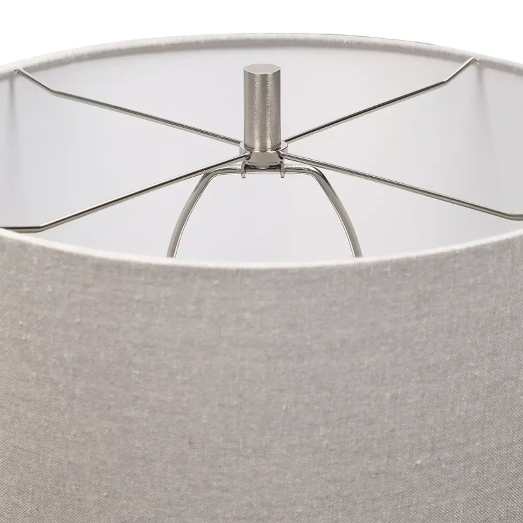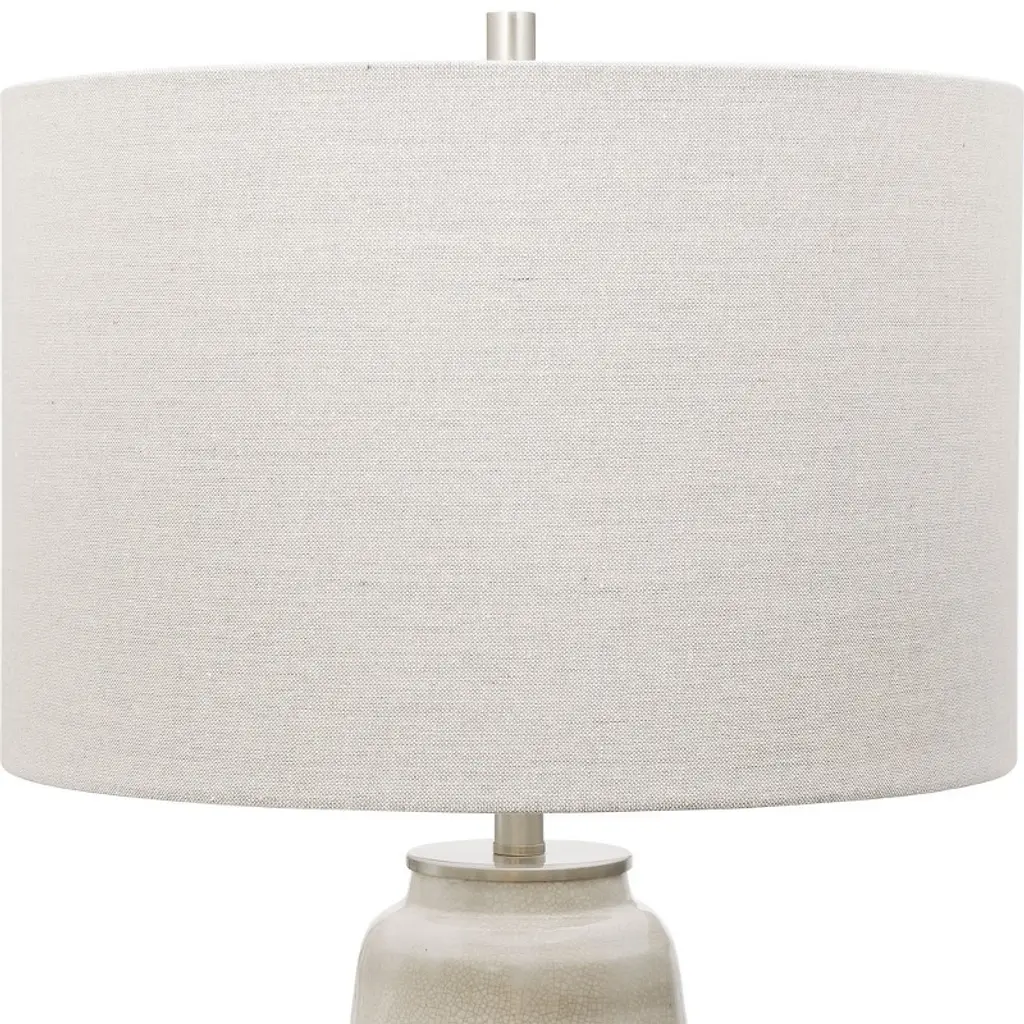 Introduce a touch of rustic elegance to your space with the Uttermost Comanche White Crackle Table Lamp. Standing at 26.5 inches tall, this ceramic lamp features a distinctive off-white crackle glaze enriched with distressed rust-brown accents for an aged, timeworn appeal. The ribbed texture along the ceramic body adds dimension and character, while brushed nickel-plated steel accents bring a refined contrast. Topped with a light gray linen fabric drum shade (15 inches wide, 10 inches high), the lamp emits soft, ambient lighting perfect for casual living rooms, bedside tables, or cozy reading nooks. Compatible with a 150W Type A bulb and equipped with a 3-way socket, it offers flexible illumination to suit any mood. Key Features: Material: Durable ceramic body with steel hardware and a fabric shade Color: Off-white crackle glaze with rust-brown distressing and brushed nickel accents Frame & Finish: Ribbed ceramic with rustic crackle finish for added texture and depth Dimensions: Overall – 26.5" H x 15" W x 15" D | Shade – 10" H, 15" W Top/Bottom Style Match: Complements rustic, farmhouse, coastal, and casual transitional interiors Shade: Round drum hardback shade in light gray linen fabric Socket & Bulb: 3-way socket supporting 1 × 150W max Type A bulb (not included) Voltage: Operates on standard 110V