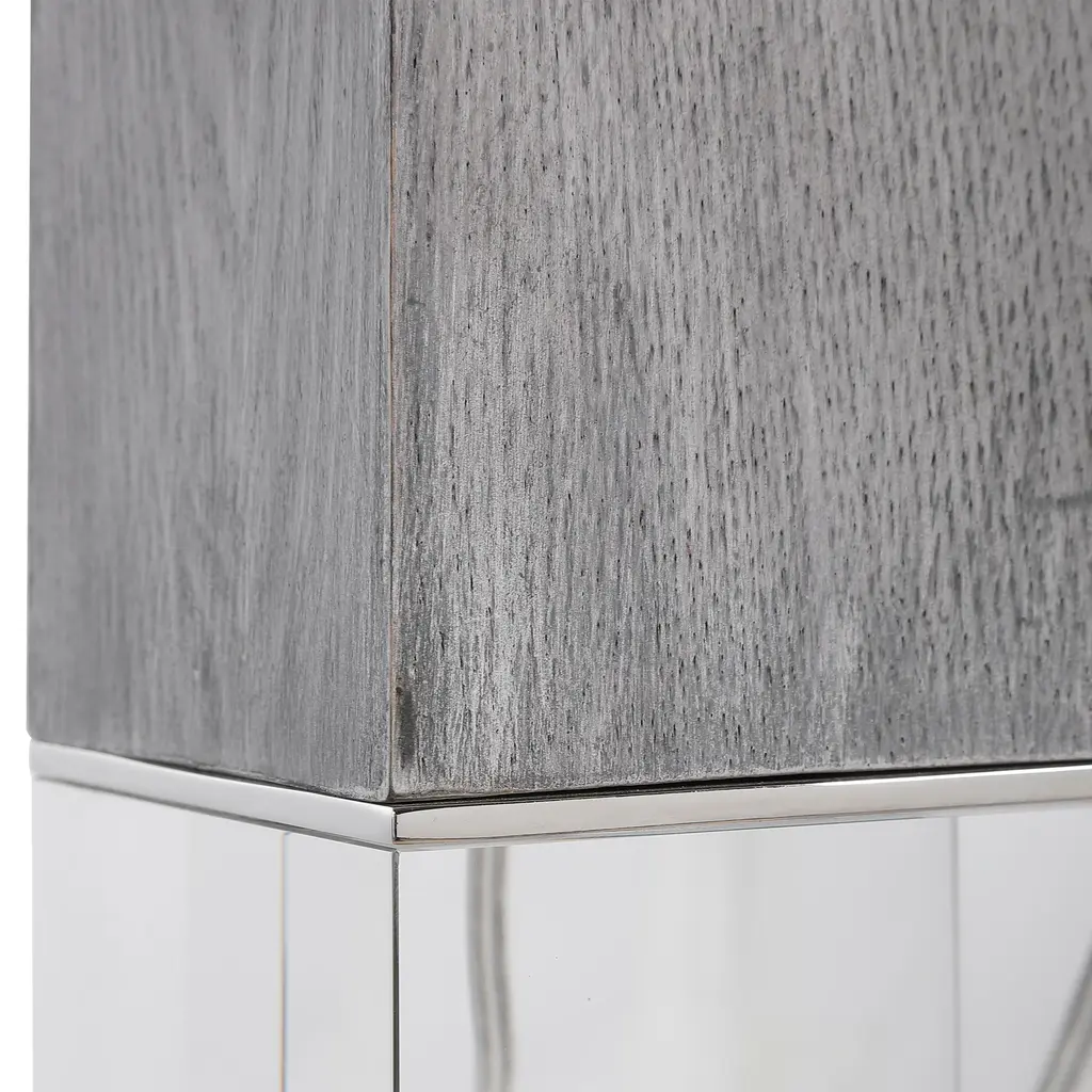 Uttermost's lamps combine premium quality materials with unique high-style design. With the advanced product engineering and packaging reinforcement, Uttermost maintains some of the lowest damage rates in the industry. Each product is designed, manufactured and packaged with shipping in mind. Inspired by modern lodge style, this table lamp features a light grey oak look, accented by polished nickel plated details and a crystal foot that elevate the sophisticated design. The lamp is paired with a white hardback drum shade. Features: Set includes: One (1) table lamp Materials: MDF, crystal, iron, fabric Finish: Light grey oak Shade color: White Designer: Renee Wightman Bulb quantity: 1 Voltage: 110V Wattage: 150W Bulb type: Type A Socket type: 3-way Shade: Round drum hardback Dimensions: Table lamp: 28.5 inches high x 16 inches wide x 16 inches deep Shade: (16x16) inches top x (16x16) inches bottom x 10 inches high This product will ship to you in one (1) box. WARNING: This product can expose you to chemicals including titanium dioxide which is known to the State of California to cause cancer. For more information, go to www.P65Warnings.ca.gov/furniture.