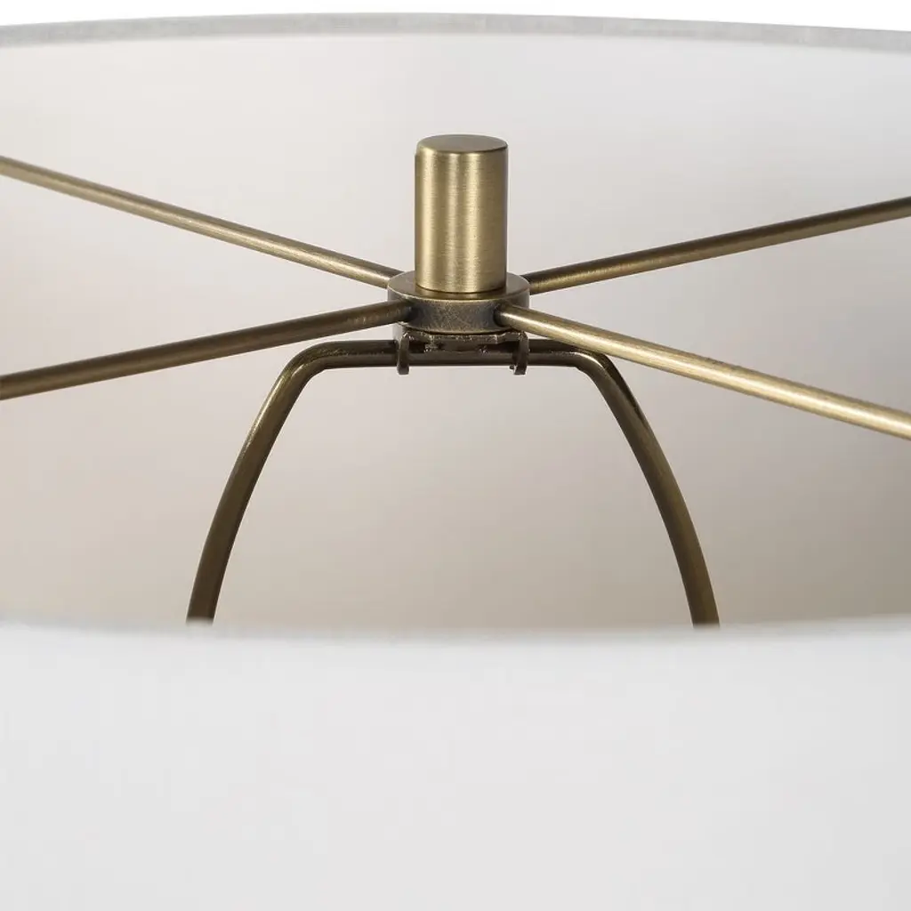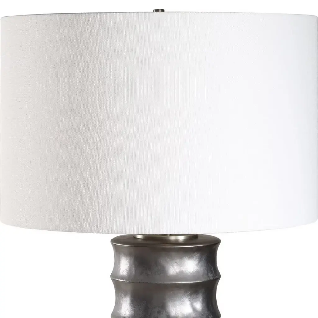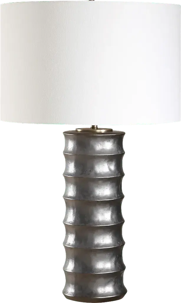 The Corvair Scalloped Table Lamp brings a perfect balance of elegance and modern sophistication to any setting. Crafted from fine porcelain, its timeless scalloped base is finished in a rich metallic dark bronze glaze that exudes warmth and luxury. Brass-plated detailing further enhances its refined appeal, creating an eye-catching contrast. A round hardback drum shade in crisp white linen tops off the design, offering a clean and inviting glow. Key Features: Porcelain base with scalloped design in metallic dark bronze glaze. Brass plated accents add a refined, contemporary touch. Round hardback drum shade in casual white linen fabric. Compatible with 1 E26 (STANDARD) bulb, 3-way socket switch, max 150W. Dimensions: 29H, Shade 11H x 17 Dia. (in); Weight: 12 lbs.