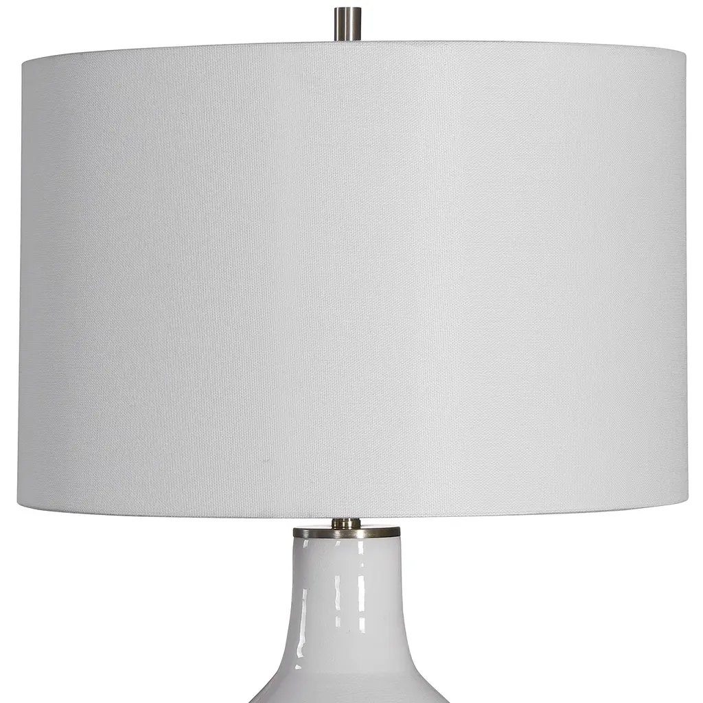 Uttermost's lamps combine premium quality materials with unique high-style design. With the advanced product engineering and packaging reinforcement, Uttermost maintains some of the lowest damage rates in the industry. Each product is designed, manufactured and packaged with shipping in mind. This ceramic lamp features a white crackle glaze finish paired with a ribbed textured bottom half finished in an aged terra cotta tone, accented by light antique brushed brass details. A simple white linen fabric drum shade compliments the piece. Features: Set includes: One (1) table lamp Materials: 80% ceramic, 10% steel and 10% fabric Finish: White crackle glaze and aged terra cotta tone Shape color: White Designer: Osvaldo Mendoza Voltage: 110V Wattage: 150W Bulb quantity: 1 Bulb type: Type A Socket type: 3-way Dimensions: Table lamp: 26.5 inches high x 15 inches wide x 15 inches deep Shade: (15x15) inches top x (15x15) inches bottom x 10 inches high This product will ship to you in one (1) box. Accessories pictured are NOT included. WARNING: This product can expose you to chemicals including nickel which is known to the State of California to cause cancer. For more information, go to www.P65Warnings.ca.gov/furniture.