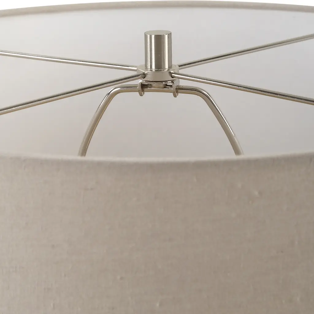 This ceramic table lamp boast a ribbed textured surface finished in a heavily distressed stone ivory with dark gray undertones. Accentuated by brushed nickel plated details, this lamp exudes rustic elegance and charm. The round hardback drum shade is a casual light beige linen fabric with natural slubbing.Uttermost's lamps combine premium quality materials with unique high-style design.With the advanced product engineering and packaging reinforcement, Uttermost maintains some of the lowest damage rates in the industry. Each product is designed, manufactured and packaged with shipping in mind. Features: Set include: One (1) Table Lamp Collection: Danala Designer: Osvaldo Mendoza Color: Ivory/dark gray Material: Steel, Ceramic, Fabric Shade: Round drum hardback shade Wattage: 150W Socket Type: 3-way Made in China No assembly required Dimensions: Dimensions: 17 inches deep x 17 inches wide x 25.25 inches high Item weight: 13 lbs This product will be shipped to you in one (1) box. Warning: This product can expose you to chemicals including nickel which is known to the State of California to cause cancer. For more information, go to www.P65Warnings.ca.gov/furniture.