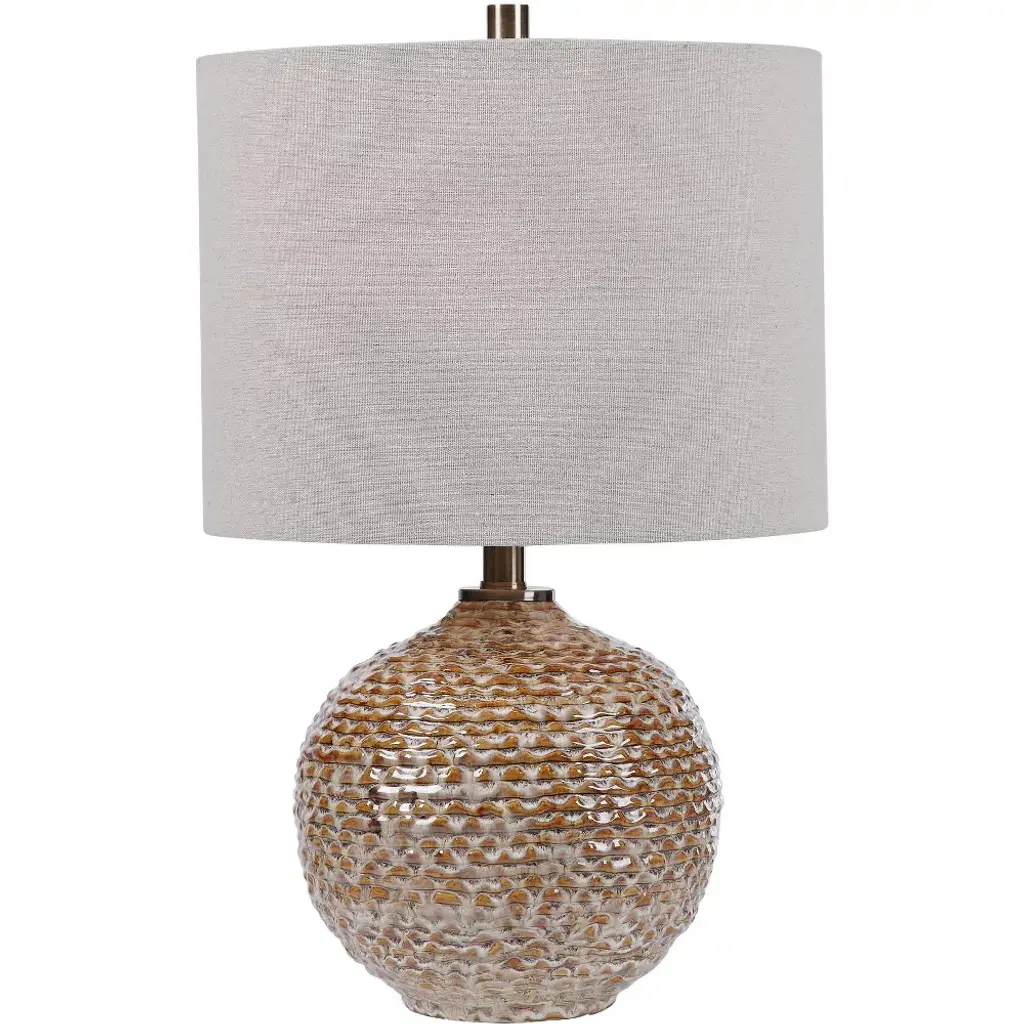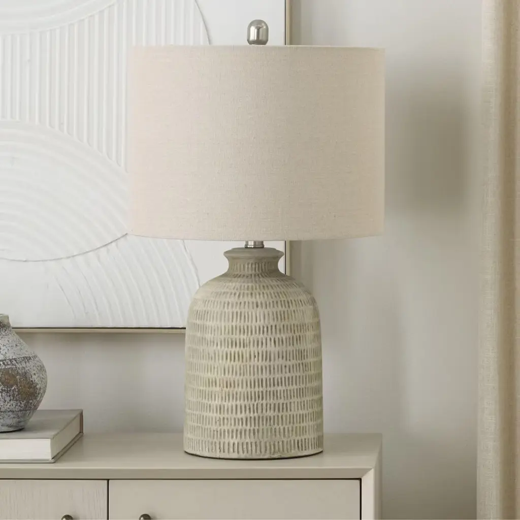This Ceramic Base Keeps It Simple, Yet Upscale With A Fashionable Pattern Finished In A Distressed Light Gray Glaze, Paired With Brushed Nickel Plated Accents. The Hardback Drum Shade Is Light Gray Linen Fabric. Uttermost''s Lamps Combine Premium Quality Materials With Unique High-style Design. With The Advanced Product Engineering And Packaging Reinforcement, Uttermost Maintains Some Of The Lowest Damage Rates In The Industry. Each Product Is Designed, Manufactured And Packaged With Shipping In Mind. DimensionsDepth: 14 in. Width: 14 in. Height: 27 in.