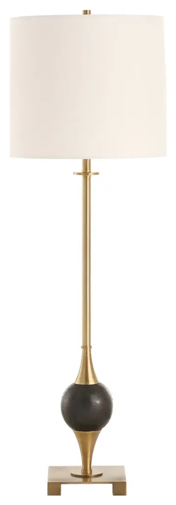 The Dempsey Buffet Lamp Features A Sleek, Sophisticated Plated Brass Base With A Complementary Foot, Elevated By The Addition Of A Striking Black Dolomite Marble Orb. The Slightly Tapered Round Hardback Shade Is Covered In A Casual White Linen Fabric.