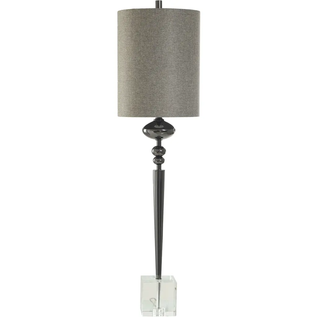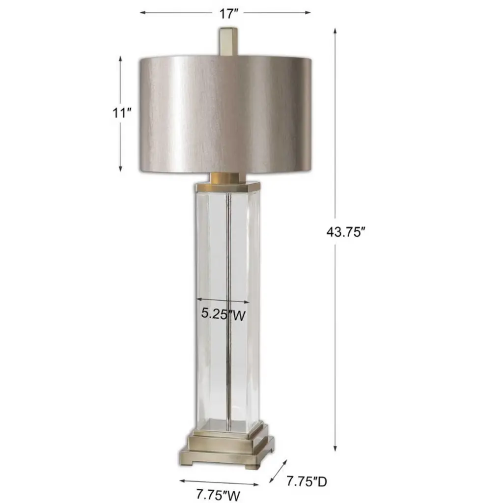 The Uttermost Drustan Clear Glass Table Lamp brings sophistication and grandeur to any room. Featuring a tall, clear glass body set on a steel base finished in bronze and silver tones, this lamp blends durability with timeless elegance. Key Features: Modern finish: Bronze and silver tones complement contemporary interiors.Ample lighting: Designed for use on large tables, consoles, or entryway spaces.Durable design: Constructed with steel and glass for lasting strength and style.Versatile use: Perfect for living rooms, bedrooms, and office décor.Easy upkeep: Wipe clean with a soft, dry cloth; avoid abrasive cleaners.