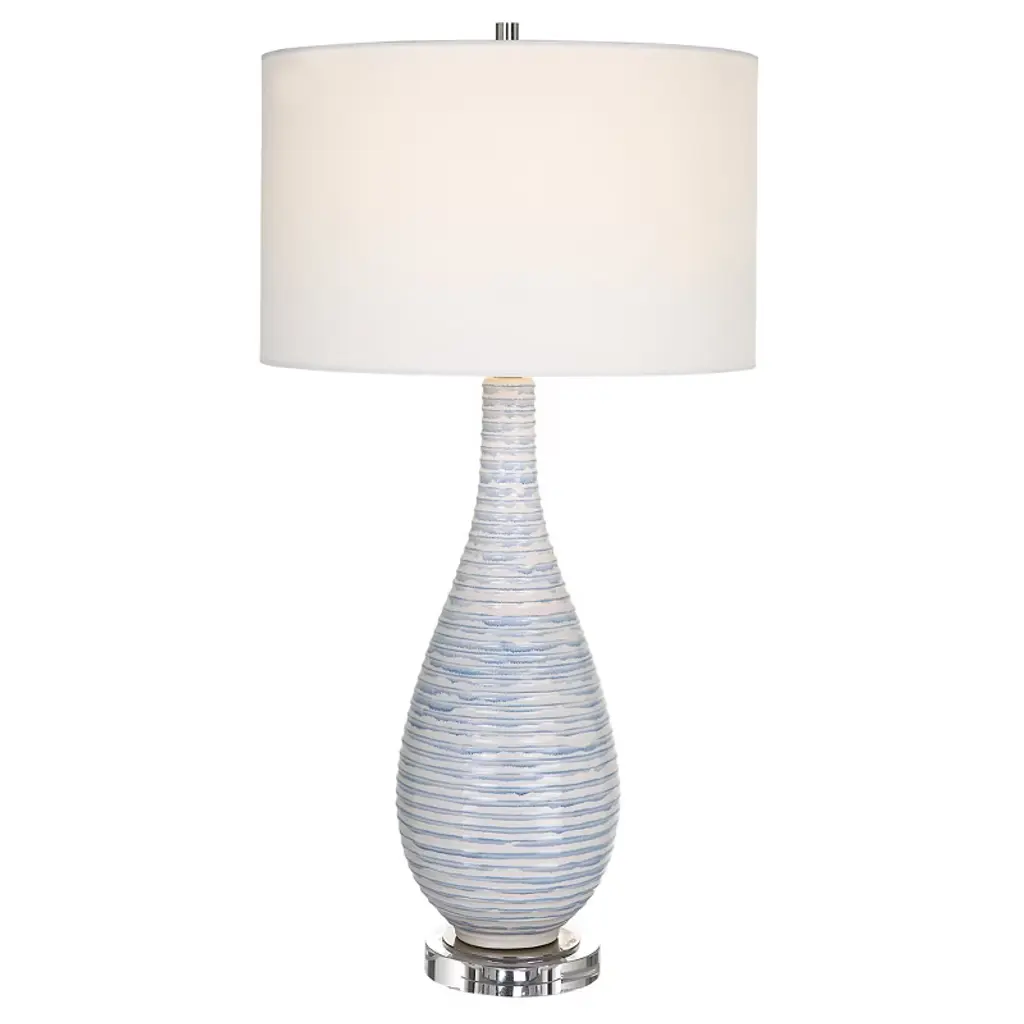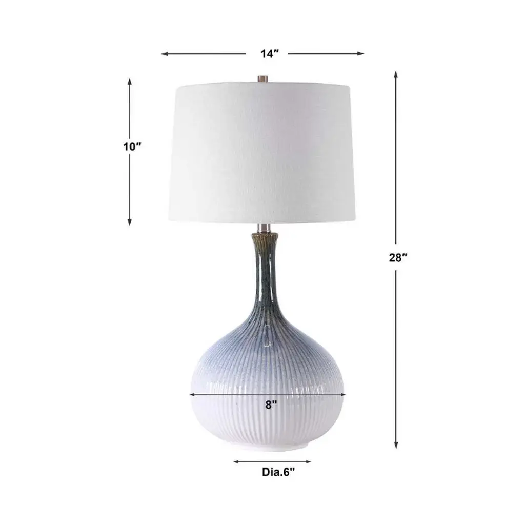 Add a vibrant mid-century modern statement with the Uttermost Eichler Mid-Century Table Lamp. Standing at 28 inches tall, this lamp showcases a beautifully fluted ceramic base with a striking ribbed texture. Its unique ombre glaze transitions gracefully through cream, light blue, indigo, and dark brown hues, creating a stunning visual effect. The brushed nickel-plated accents add a sleek contrast, while the off-white tapered round hardback shade with light slubbing softens the light, making it perfect for living rooms, bedrooms, or offices. Featuring a 3-way socket compatible with up to 150W Type A bulbs, this lamp offers versatile lighting to suit your ambiance needs. Key Features: Material: Durable ceramic base, iron accents, and fabric shade Color: Ombre glaze in cream, light blue, indigo, dark brown with brushed nickel accents Frame & Finish: Fluted ribbed ceramic base with brushed nickel-plated details Dimensions: Overall – 28" H x 14" W x 14" D | Shade – 10" H, Top: 13" W x 13" D, Bottom: 14" W x 14" D Style Match: Ideal for mid-century modern, contemporary, and eclectic interiors Shade: Off-white tapered round hardback fabric shade with light slubbing Socket & Bulb: 3-way socket supporting 1 × 150W max Type A bulb (not included) Voltage: Standard 110V power requirement