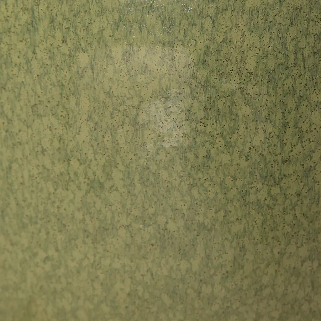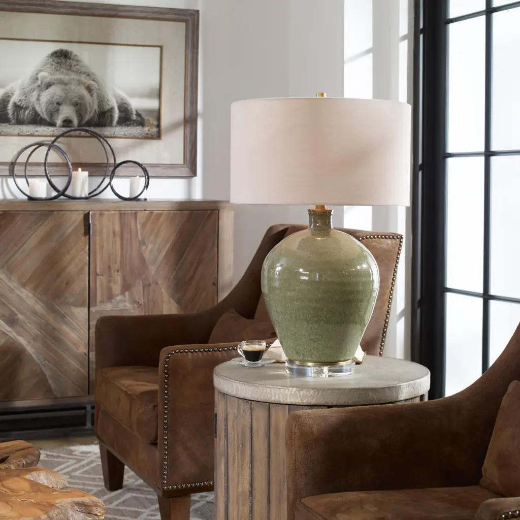 This ceramic base is finished in a distressed emerald green glaze, accented with antique brass plated details and a crystal foot.