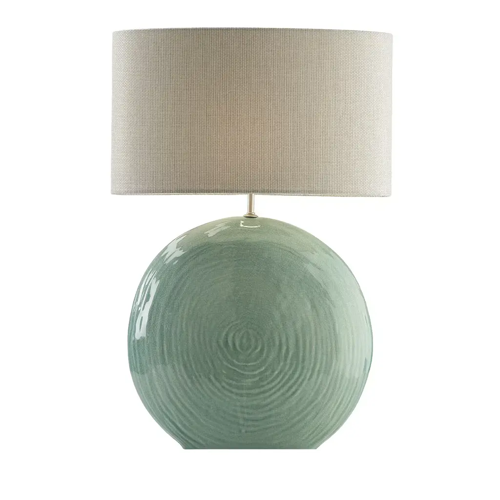 This Ceramic Table Lamp Features An Interesting Organic Texture Of Vertical Cuts. The Reactive Glaze Naturally Creates A Dynamic Layering Of Different Levels Of Beautiful Blues, Greens, And Creams, Paired With Antique Brass Plated Details. A Round Hardback Drum Shade Made With A Casual White Linen Fabric Completes The Piece. Due To The Nature Of Fired Glazes On Ceramic Lamps, Finishes Will Vary Slightly.