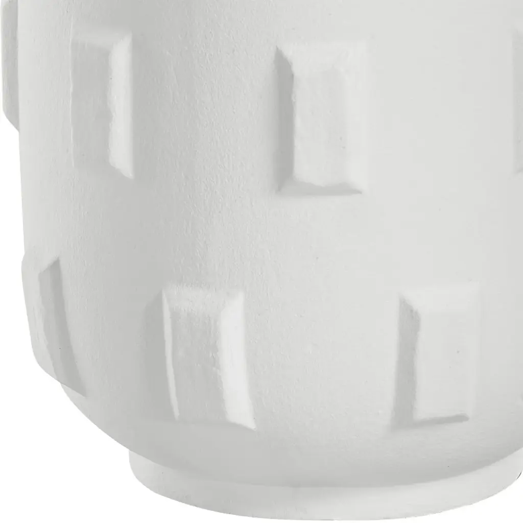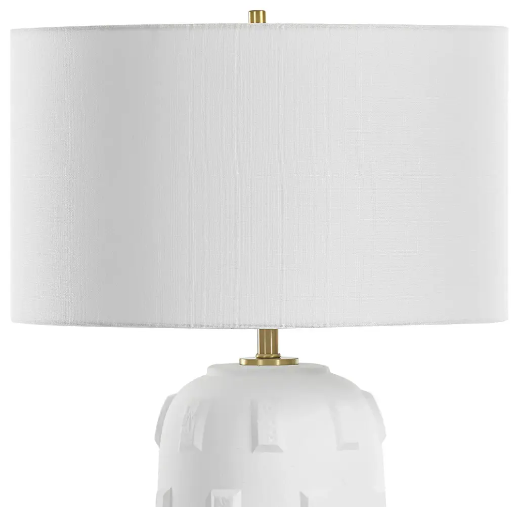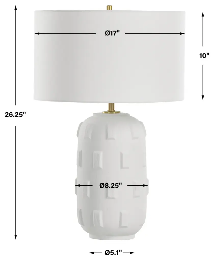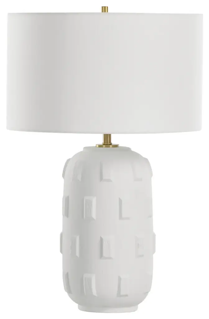 The Emerie Table Lamp Features A Porcelain Body With A Repeating Raised Brick Pattern And Noticeable Texture, Finished In A Chalk White Glaze Accented With Antique Brass Plated Details. The Round Hardback Drum Shade Is A Casual White Linen Fabric.