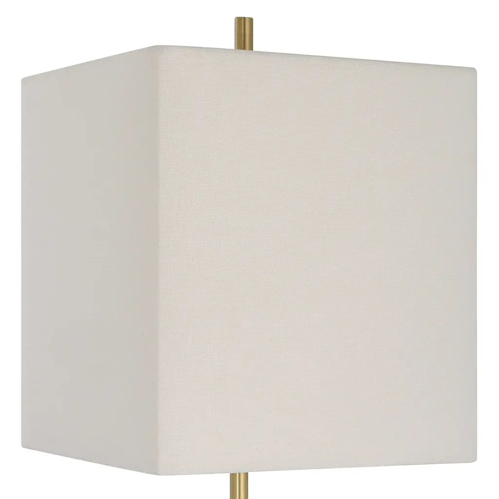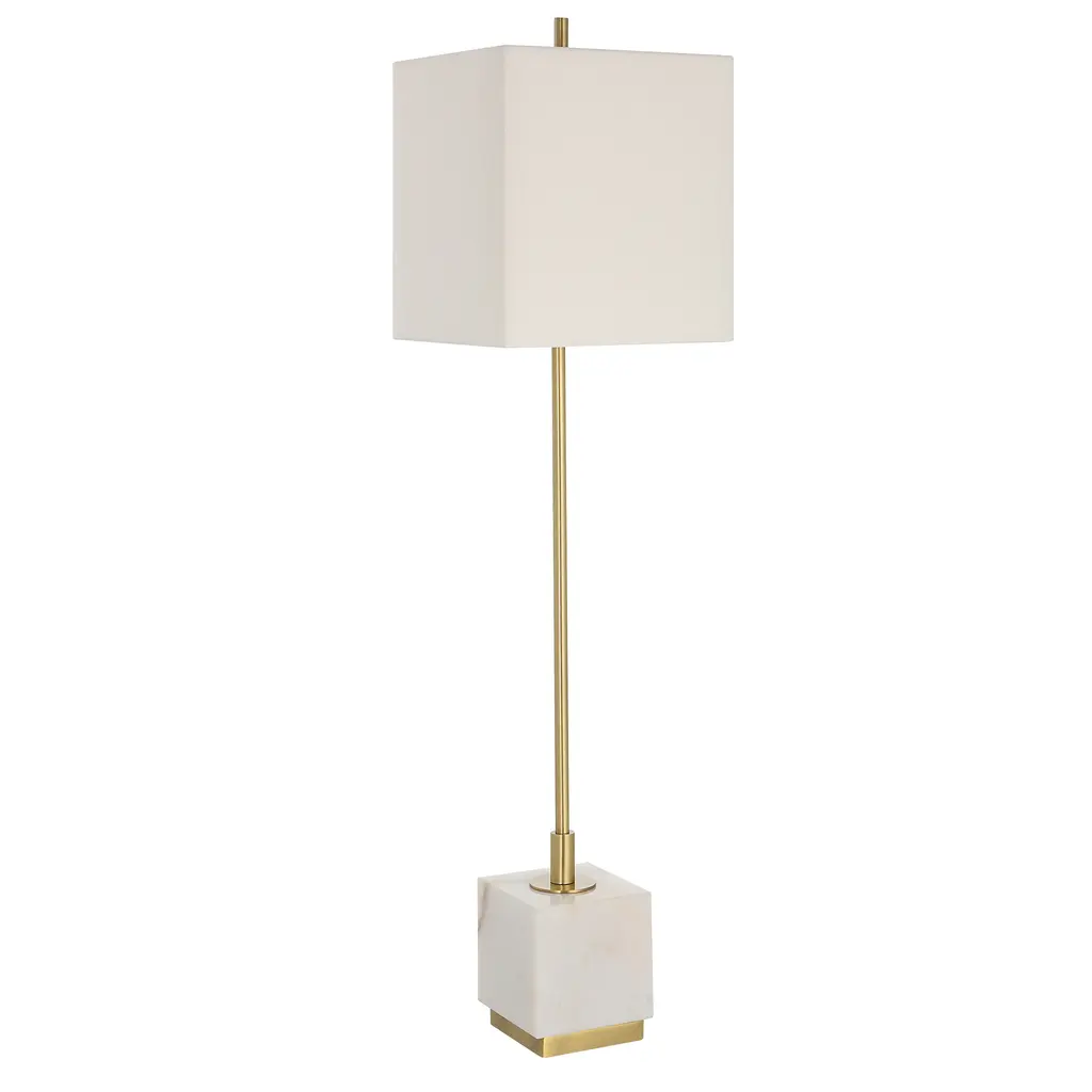 This versatile buffet lamp showcases a slim plated brushed brass metal base accented by a large white marble block foot with natural veining. The square hardback shade is covered in a slubbed white linen fabric. Uttermost's lamps combine premium quality materials with unique high-style design. With the advanced product engineering and packaging reinforcement, Uttermost maintains some of the lowest damage rates in the industry. Each product is designed, manufactured and packaged with shipping in mind. Features: Set Includes: One (1) buffet lamp Materials: Metal, Marble, Fabric Finish: Plated brushed brass Dimensions: Overall dimensions: 9 inches wide x 37 inches high x 9 inches deep Item weight: 12 lbs This product will ship to you in one (1) box.WARNING: This product can expose you to chemicals including nickel which is known to the State of California to cause cancer. For more information, go to www.P65Warnings.ca.gov/furniture.