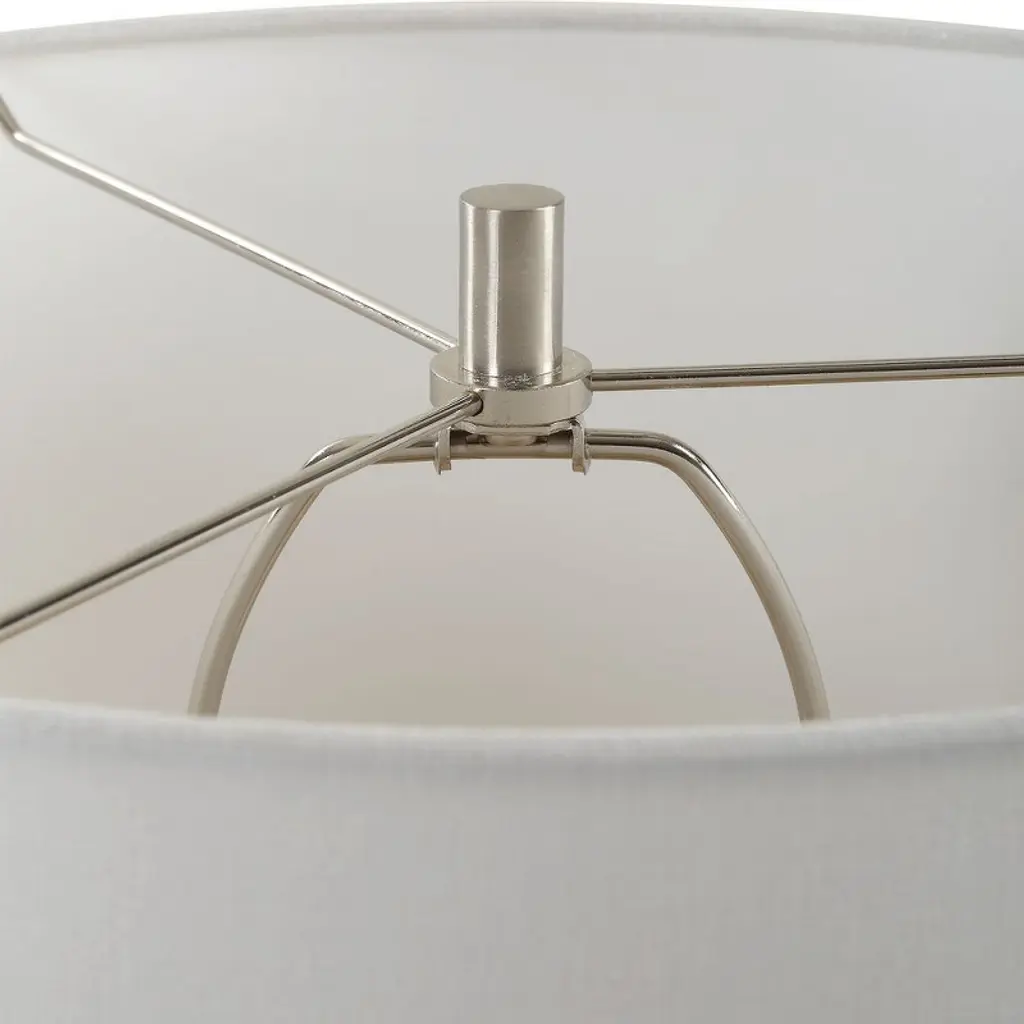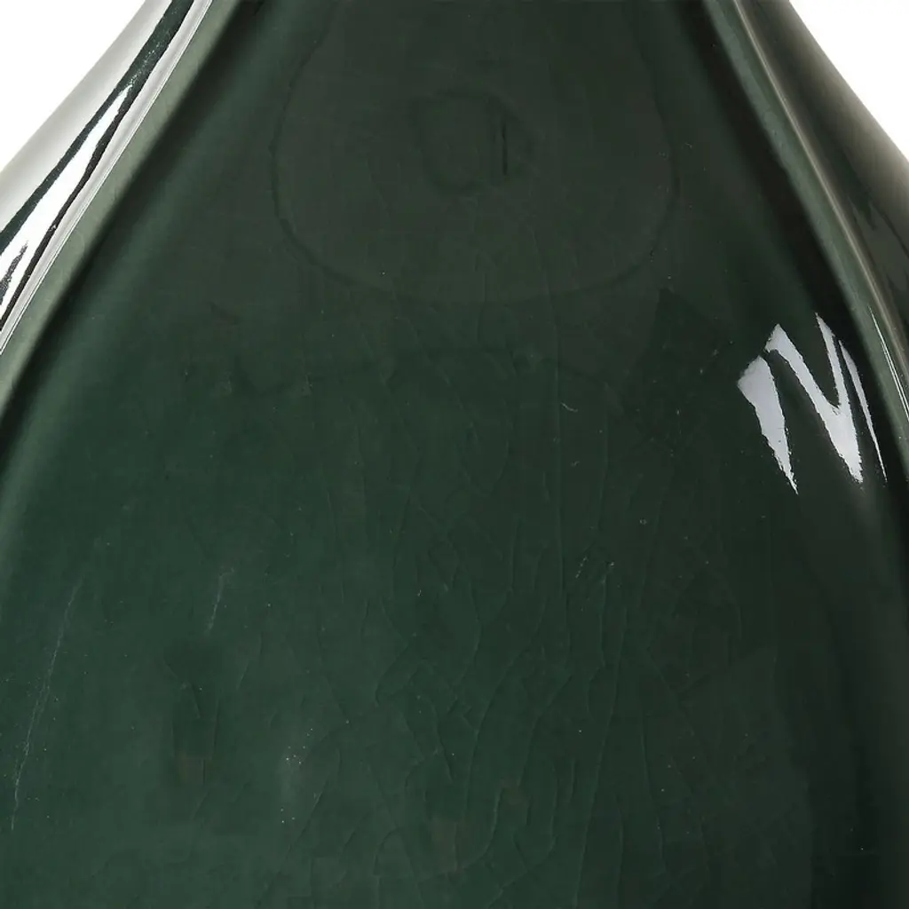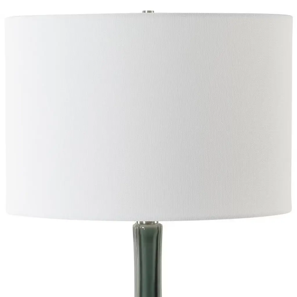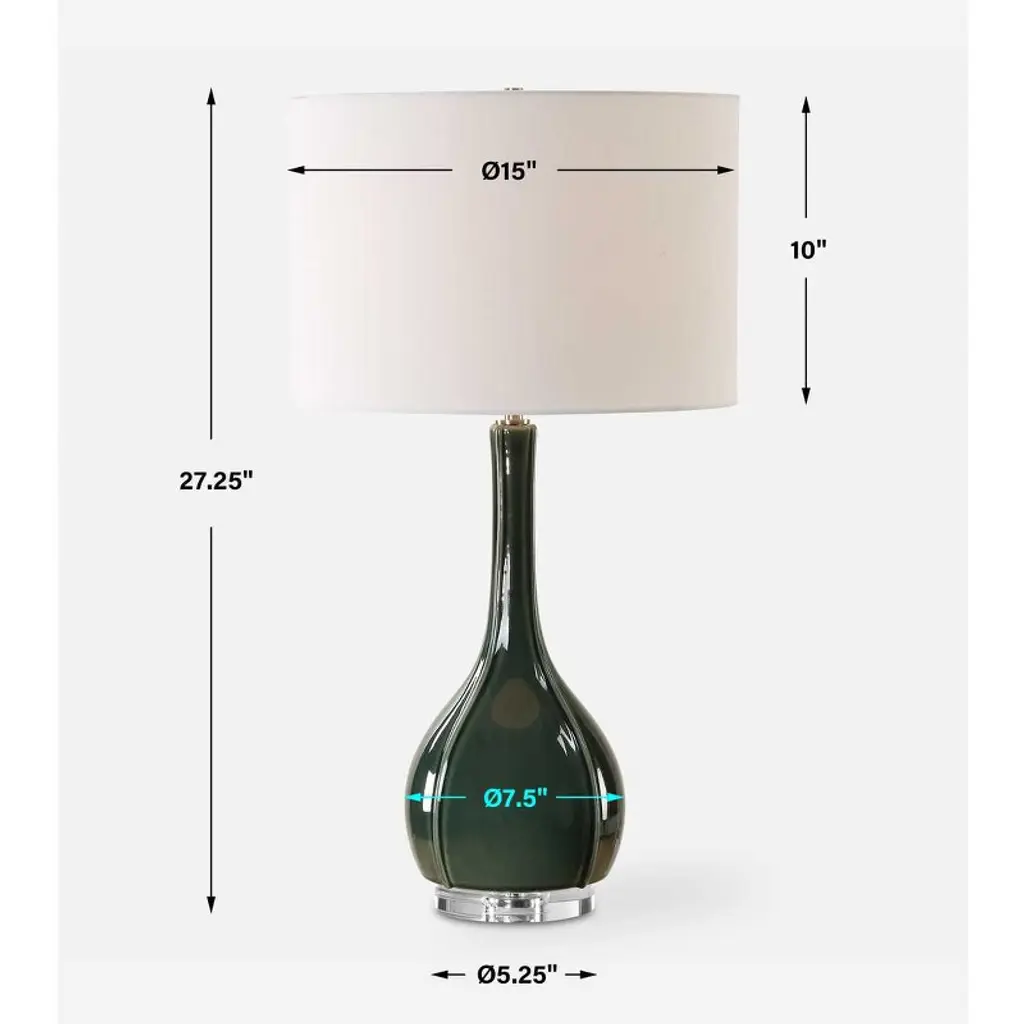 The Essex Green Glass Table Lamp features a fluted ceramic base finished in a striking hunter green crackled glaze, lending a sophisticated and artistic appeal. A thick crystal foot and plated brushed nickel hardware add a luxurious touch, elevating its modern elegance. Topped with a round drum hardback shade in casual white linen, this lamp provides soft, ambient lighting that enhances any room's décor. Perfect for bedside tables, living rooms, or entryway consoles, it combines timeless style with contemporary details. Key Features: Fluted ceramic base with rich hunter green crackled glaze. Elegant crystal foot and brushed nickel hardware for a refined look. White linen round drum hardback shade for warm, ambient lighting. Compatible with 1 E26 standard bulb (3-way socket switch). Dimensions – 27H, Shade 10H x 15 Dia. (in), Weight – 11 lbs.