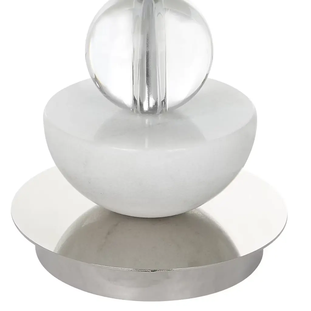 The Uttermost Exposition Buffet Lamp combines contemporary refinement with luxurious materials. Its polished nickel iron base is paired with natural white marble and crystal accents, creating a sleek and sophisticated aesthetic. The white linen drum shade softens illumination for warm ambient lighting. Designed and packaged for durability, this lamp is ideal for buffet tables, sideboards, living rooms, entryways, or any modern interior seeking a stylish accent piece. Key Benefits / Specifications: Material: Iron, marble, crystal, fabric Overall Dimensions: 10"D x 10"W x 33.5"H Shade Dimensions: Height 11", Top 10"W x 10"D, Bottom 10"W x 10"D Bulb Type: TYPE A, 3-way, 150W max Number of Lights: 1 Finish/Frame Description: Polished nickel iron base with marble and crystal accents Shade Description: Round hardback drum, white linen Designer: David Frisch Product Attributes: Premium quality materials, high-style design, reinforced packaging for low damage rates