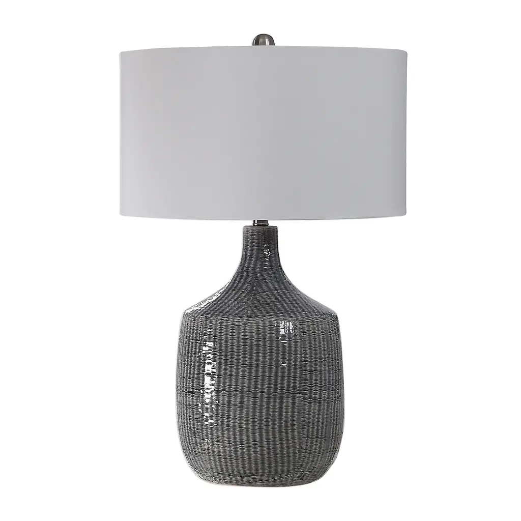 Decorate a bare end table with this appealing Felipe table lamp's modern shape and transitional styling. A distressed grey glaze adds texture and depth to this lamp's wide ceramic body, while a crisp white hardback shade brings a polished finish to the piece. With a three-way socket, this lamp offers lighting options from bright for reading to dim for watching TV.Set includes: One (1) table lampMaterial: Medium Temperature Ceramic and Linen FabricFinish: Distressed Grey Glaze and Brushed Nickel PlatedDesigner: Jim ParsonsShade description: Round drum hardback shadeNumber of lights: 1Wattage: 150 WBulb quantity: 1Bulb type: Type ASocket type: 3-WayVoltage: 110 VDimensions:Table lamp dimensions: 29 inches high x 19 inches wide x 19 inches deepShade dimensions: (19x19) inches top x (19x19) inches bottom x 10.5 inches highThis product will ship to you in one (1) box.Accessories pictured are NOT included.