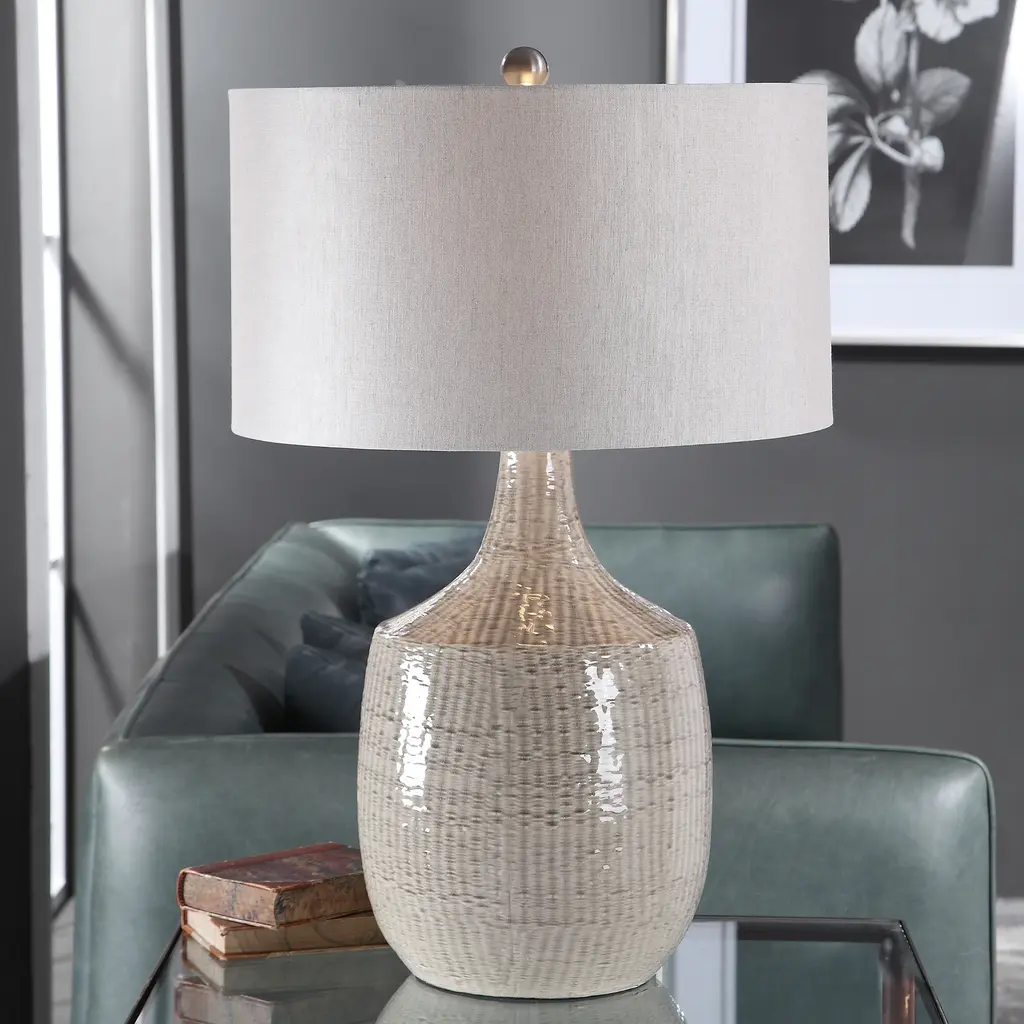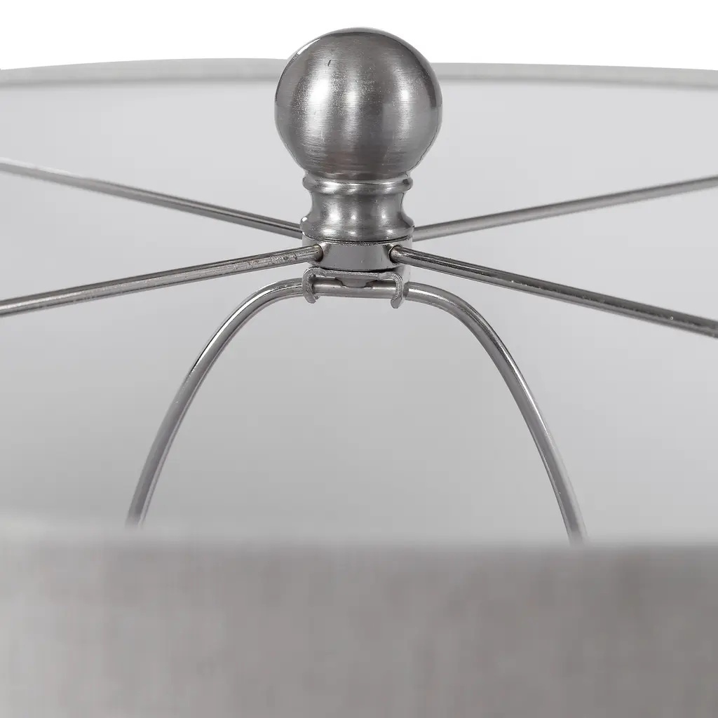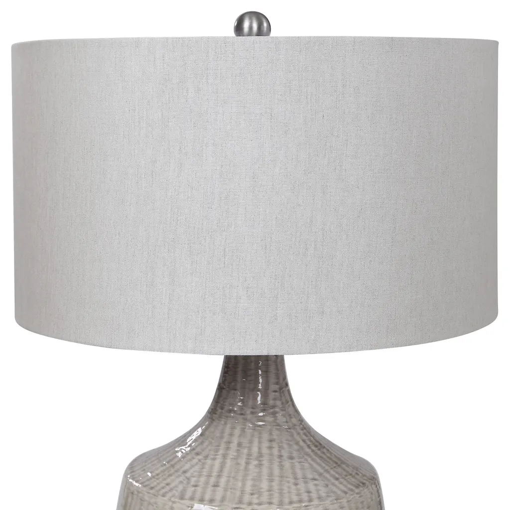Uttermost's lamps combine premium quality materials with unique high-style design. With the advanced product engineering and packaging reinforcement, Uttermost maintains some of the lowest damage rates in the industry. Each product is designed, manufactured and packaged with shipping in mind. This ceramic base keeps it simple in shape, yet upscale with its fashionable pattern that's finished in a distressed light grey glaze, paired with brushed nickel plated accents. The hardback drum shade is light grey linen fabric. Features: Set includes: One (1) table lamp Materials: 80% ceramic, 15% fabric and 5% iron Finish: Distressed light grey glaze Shape color: Light grey Designer: Jim Parsons Voltage: 110V Wattage: 150W Bulb quantity: 1 Bulb type: Type A Socket type: 3-way Dimensions: Table lamp: 29.5 inches high x 19 inches wide x 19 inches deep Shade: (19x19) inches top x (19x19) inches bottom x 10.5 inches high This product will ship to you in one (1) box. Accessories pictured are NOT included. WARNING: This product can expose you to chemicals including nickel which is known to the State of California to cause cancer. For more information, go to www.P65Warnings.ca.gov/furniture.