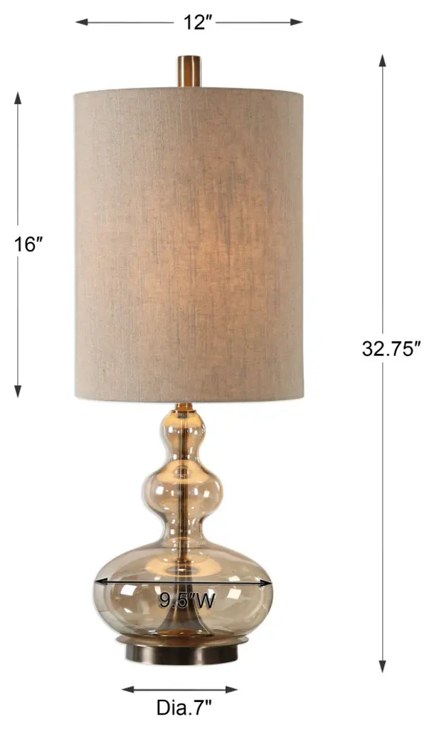 One Light Table Lamp from Formoso collection in Antique Brass Steel finish. Number of Bulbs 1. Max Wattage 150.00 . No bulbs included. Curvaceous, Light Amber Glass, Accented With Antique Brass Plated Steel Details. The Tall, Round Hardback Shade Is A Khaki Linen Fabric With Natural Slubbing. No UL Availability at this time.