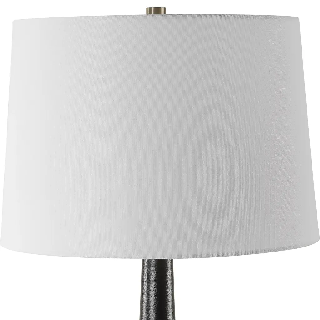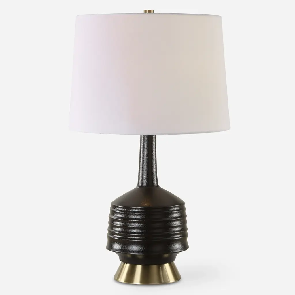 This table lamp features a ribbed ceramic base adorned in a lightly textured black glaze, displayed on a plated antique brass tapered foot. The tapered round hardback shade is covered in a crisp white linen fabric.Uttermost's lamps combine premium quality materials with unique high-style design.With the advanced product engineering and packaging reinforcement, Uttermost maintains some of the lowest damage rates in the industry. Each product is designed, manufactured and packaged with shipping in mind. Features: Set include: One (1) Table Lamp Collection: Foster Designer: David Frisch Color: Black glaze Material: Ceramic, Metal, Fabric Finish/Frame: Brass Shade: Round hardback shade Wattage: 150W Socket Type: 3-way Made in China No assembly required Dimensions: Dimensions: 16 inches deep x 16 inches wide x 26 inches high Item weight: 7.3 lbs This product will be shipped to you in one (1) box. Warning: This product can expose you to chemicals including nickel which is known to the State of California to cause cancer. For more information, go to www.P65Warnings.ca.gov/furniture.