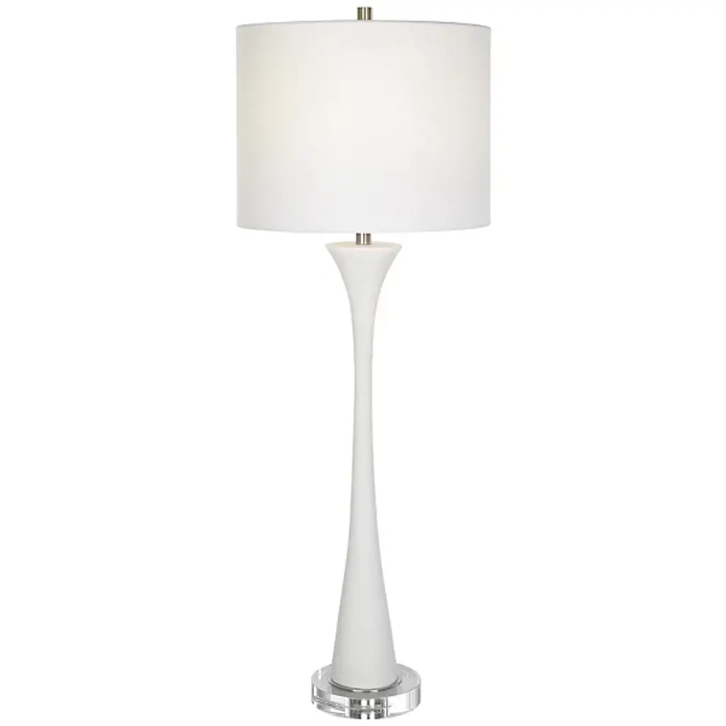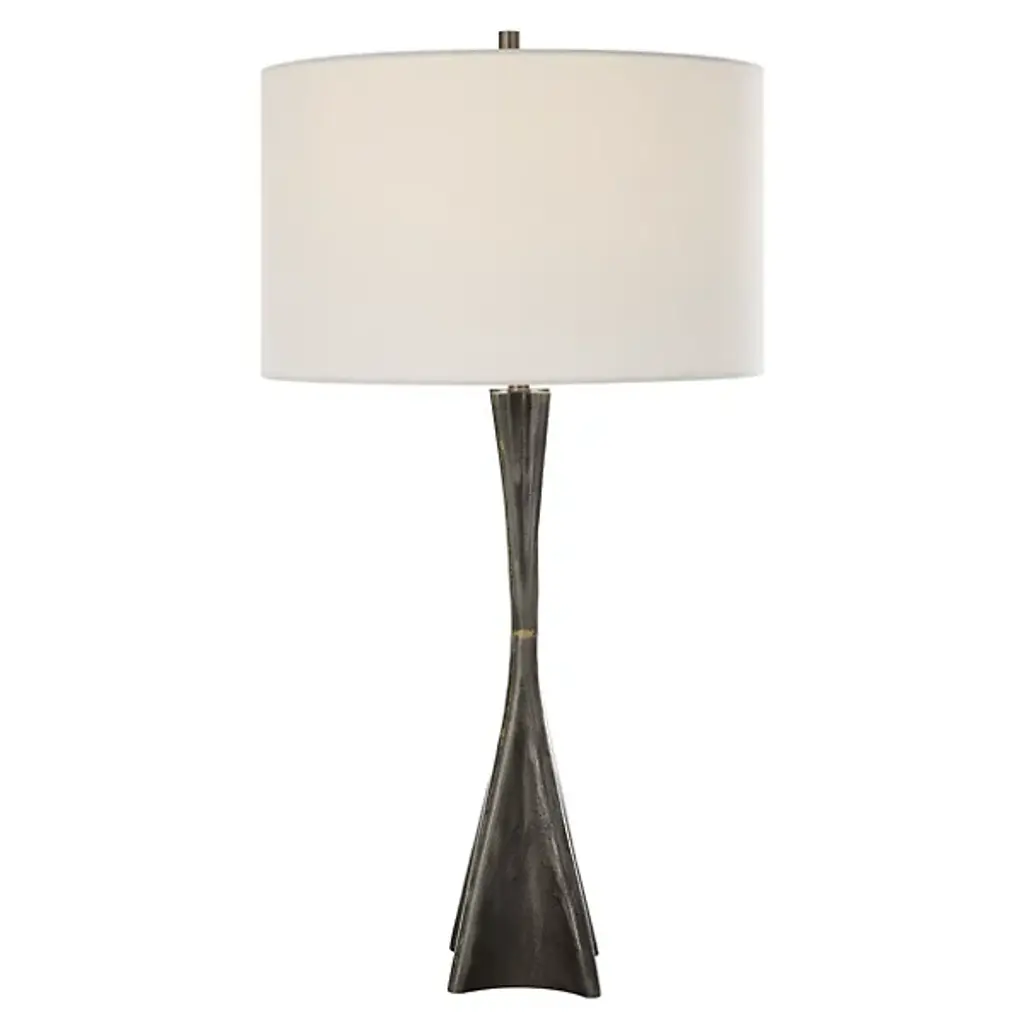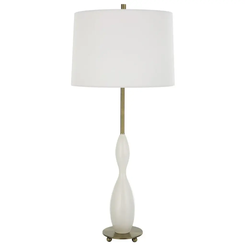 Showcasing A Classic Trumpet Shape, This Buffet Lamp Is Handcrafted From A Man-made Black Stone, Displayed On A Thick Crystal Foot, Paired With Brushed Brass Plated Accents. A White Fabric Shade Completes The Piece. Uttermost''s Lamps Combine Premium Quality Materials With Unique High-style Design. With The Advanced Product Engineering And Packaging Reinforcement, Uttermost Maintains Some Of The Lowest Damage Rates In The Industry. Each Product Is Designed, Manufactured And Packaged With Shipping In Mind. DimensionsDepth: 12 in. Width: 12 in. Height: 34 in.
