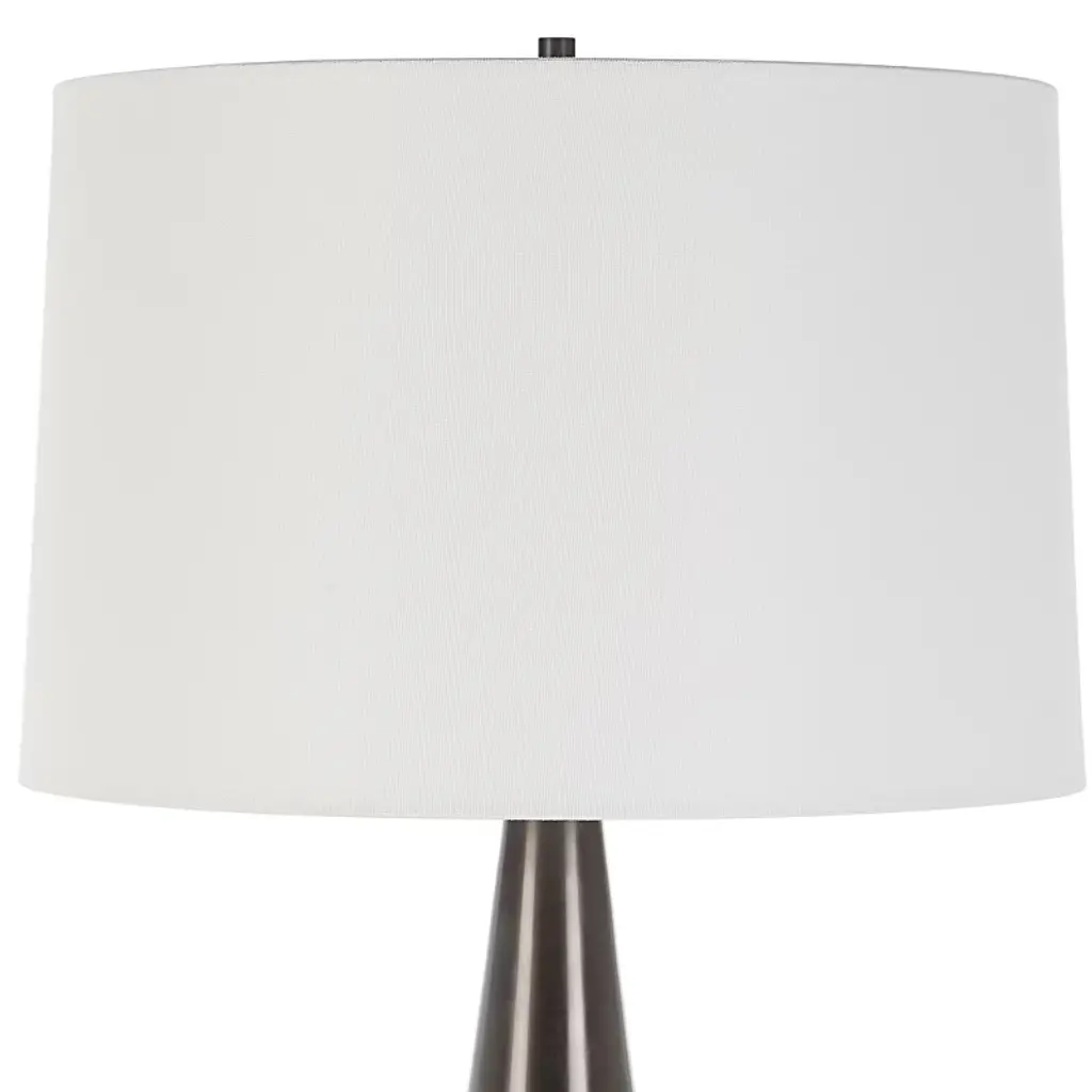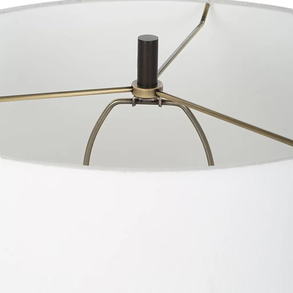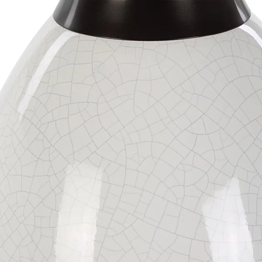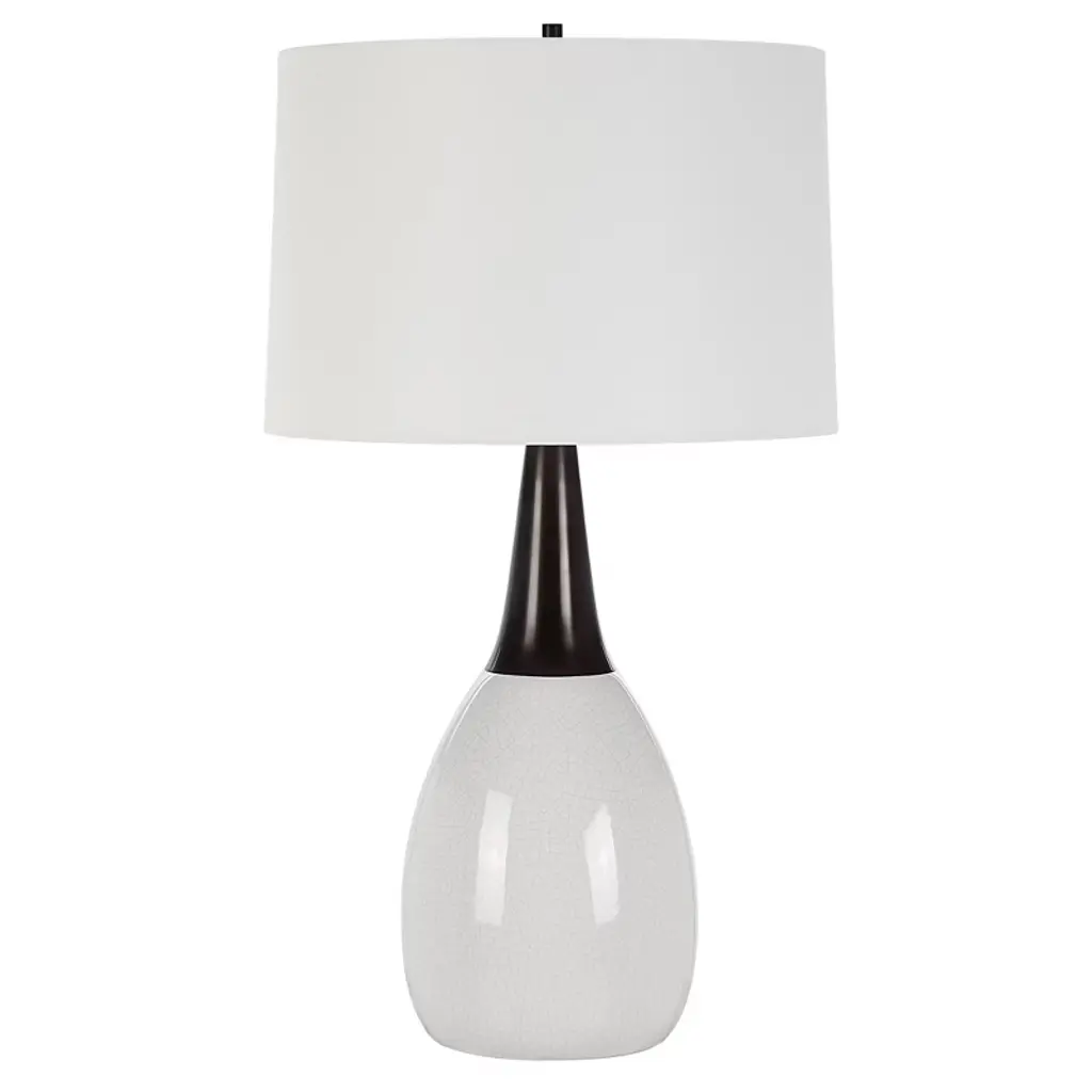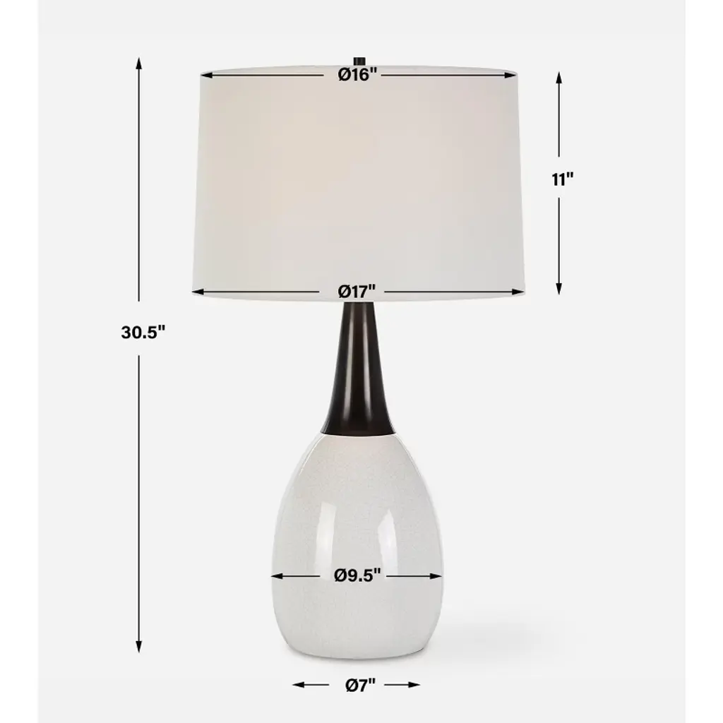 The Fralin White Table Lamp showcases an artful blend of textures and tones, making it a statement piece for refined interiors. Its crackled white ceramic base flows into a sleek black iron fluted neck, creating a bold yet graceful contrast. Topped with a slightly tapered round hardback shade crafted from crisp white linen fabric, this lamp exudes modern sophistication while offering a soft, ambient glow. Perfect for bedside tables, living rooms, or elegant office spaces, the Fralin Lamp combines timeless craftsmanship with contemporary design. Key Features: Crackled white ceramic base paired with a black iron fluted neck for a striking contrast. Slightly tapered round hardback shade in crisp white linen fabric. Equipped with 1 E26 (STANDARD) bulb socket with 3-way switch. 150W maximum wattage for optimal illumination. Dimensions – 31 H, Shade: 11 H x 17 Dia. (in), Weight – 14 lbs.