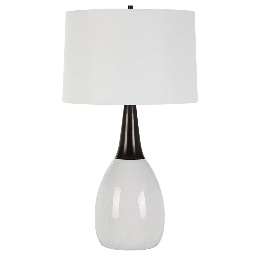 This unique table lamp seamlessly blends elegance and uniqueness into one captivating design. The crackled white ceramic base flows gracefully into a black iron fluted neck, creating a striking and seamless transition. The lamp is topped with a slightly tapered round hardback shade in a crisp white linen fabric.Uttermost's lamps combine premium quality materials with unique high-style design.With the advanced product engineering and packaging reinforcement, Uttermost maintains some of the lowest damage rates in the industry. Each product is designed, manufactured and packaged with shipping in mind. Features: Set include: One (1) Table Lamp Collection: Fralin Designer: Carolyn Kinder Color: White Material: Ceramic, Iron, Fabric Finish/Frame: White Shade: Round hardback shade Wattage: 150W Socket Type: 3-way Made in China No assembly required Dimensions: Dimensions: 17 inches deep x 17 inches wide x 30.5 inches high Item weight: 12 lbs This product will be shipped to you in one (1) box. Warning: This product can expose you to chemicals including nickel which is known to the State of California to cause cancer. For more information, go to www.P65Warnings.ca.gov/furniture.