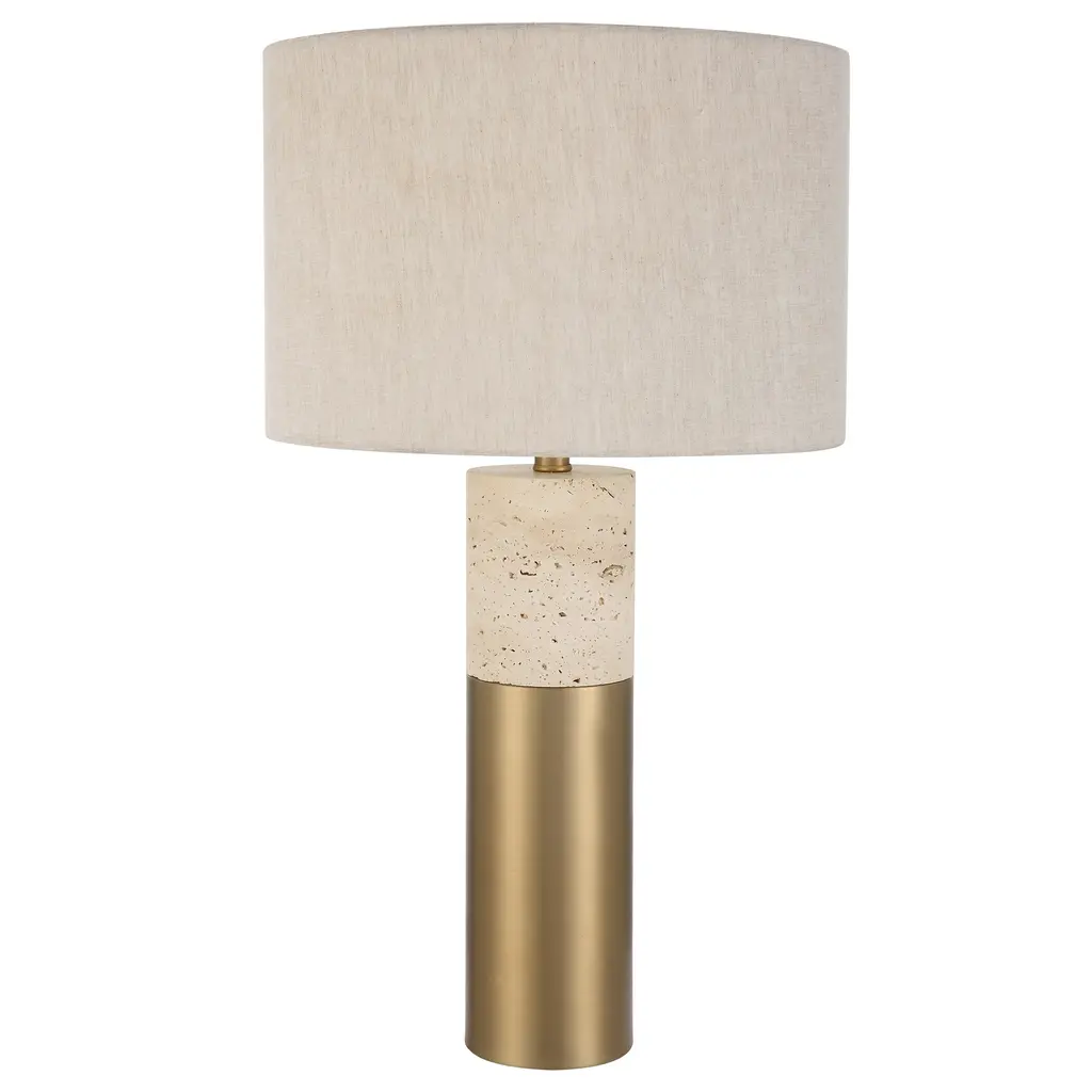 The Gravitas table lamp lives up to its name with its sophisticated finishes and design. The iron column base is finished in an elegant plated brushed brass with a porous ivory stone top. The lamp is paired with a casual light beige linen shade with subtle texture. Uttermost's lamps combine premium quality materials with unique high-style design. With the advanced product engineering and packaging reinforcement, Uttermost maintains some of the lowest damage rates in the industry. Each product is designed, manufactured and packaged with shipping in mind. Features: Set Includes: One (1) table lamp Materials: Iron, Offwhite Travertine, Linen Finish: Plated brushed brass Shade: Round drum hardback shade 1 Light - 1 Bulb required 110 V - 150 W Bulb Type: Type A Socket Type: 3-WAY Designer: David Frisch Collection: Gravitas Dimensions: Overall dimensions: 16 inches wide x 27.5 inches high x 16 inches deep Shade size: Height: 10.5 inches, Top: 16 inches wide x 16 inches deep, Bottom: 16 inches wide x 16 inches deep Item weight: 16.06 lbs This product will ship to you in one (1) box. WARNING: This product can expose you to chemicals including titanium dioxide which is known to the State of California to cause cancer. For more information, go to www.P65Warnings.ca.gov/furniture.