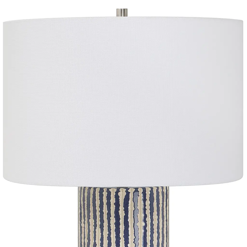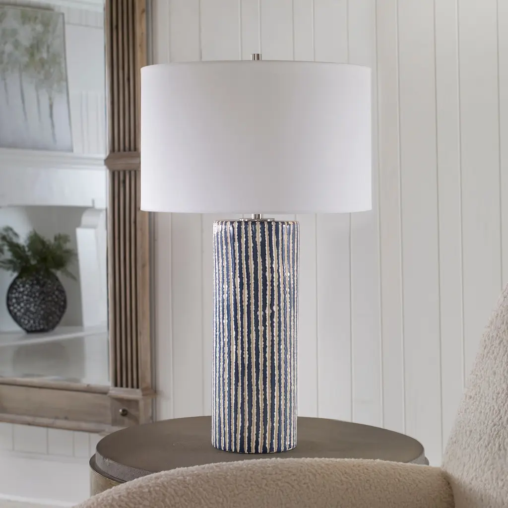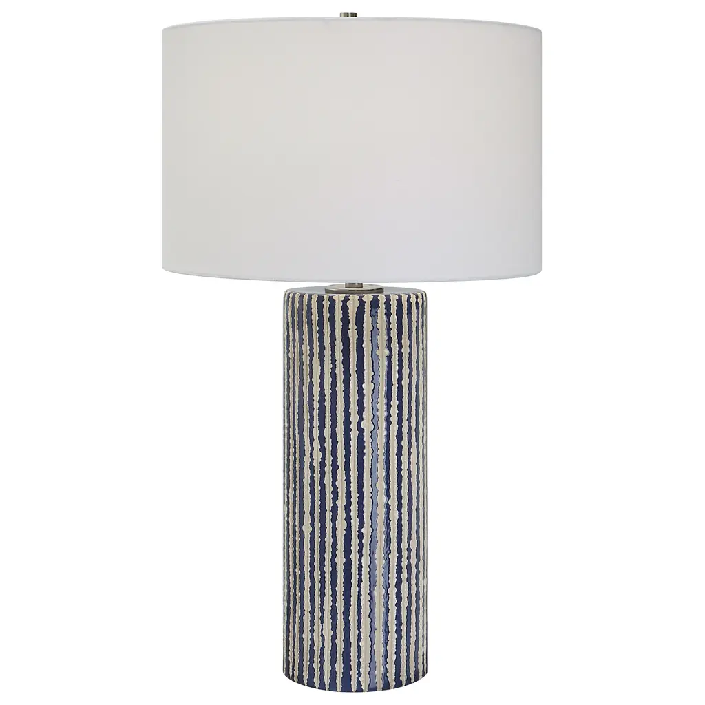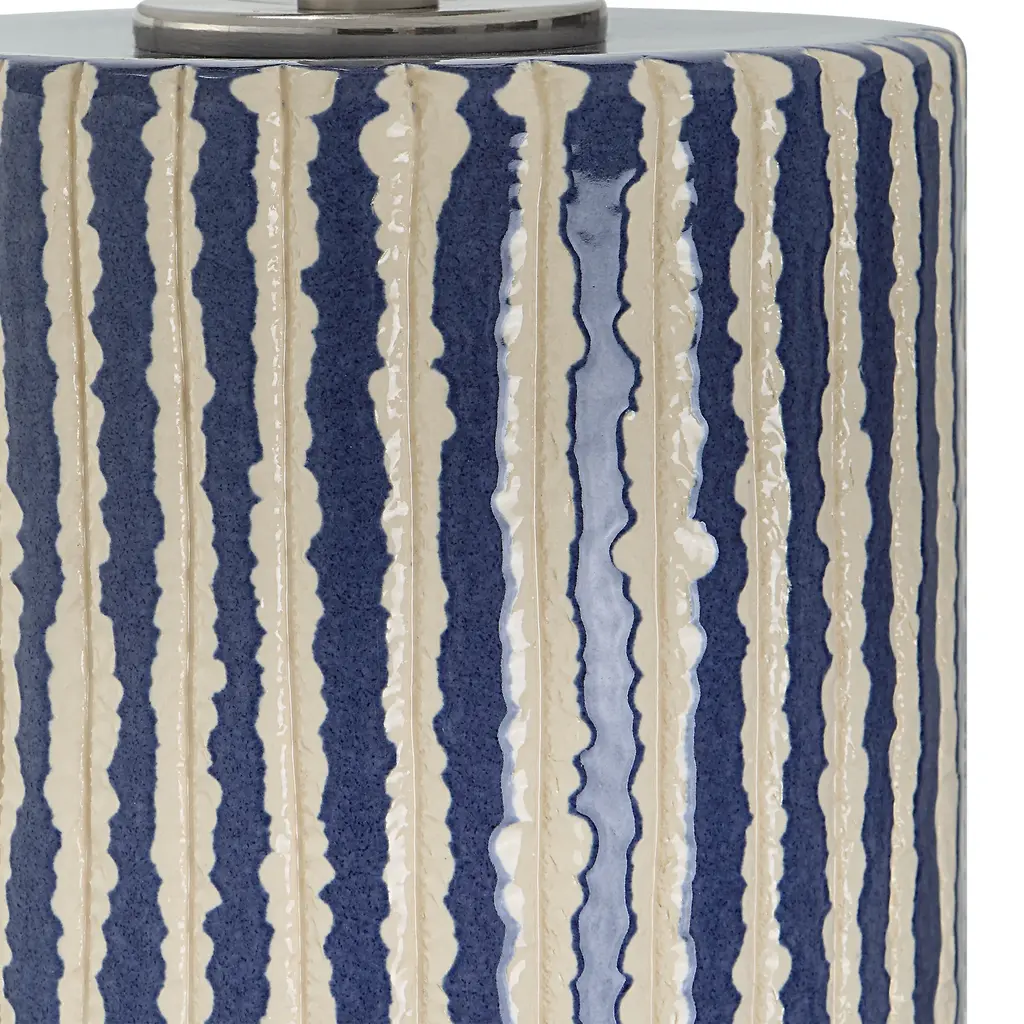 Uttermost's lamps combine premium quality materials with unique high-style design. With the advanced product engineering and packaging reinforcement, uttermost maintains some of the lowest damage rates in the industry. Each product is designed, manufactured and packaged with shipping in mind. This ceramic table lamp features eye-catching, crudely carved, cobalt glazed stripes with contrasting ivory, accented with brushed nickel details. The round hardback shade is covered in a white fabric. Features: Set includes: One (1) table lamp Materials: Ceramic, iron, fabric Finish: Ivory, cobalt, nickel Shade color: White Designer: Carolyn Kinder Shade: Round hardback drum Wattage: 150W Bulb quantity: 1 Bulb type: TYPE A Socket type: 3-WAY Voltage: 110 V Dimensions: Table lamp: 27.5 inches high x 16 inches wide x 16 inches deep Shade: 10 inches high x (16 x 16) inches top x (16 x 16) inches bottom This product will ship to you in one (1) box. WARNING: This product can expose you to chemicals including nickel which is known to the State of California to cause cancer. For more information, go to www.P65Warnings.ca.gov/furniture.