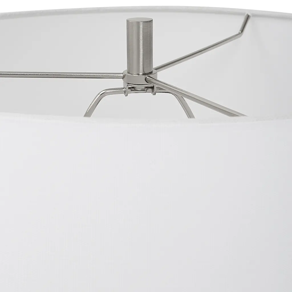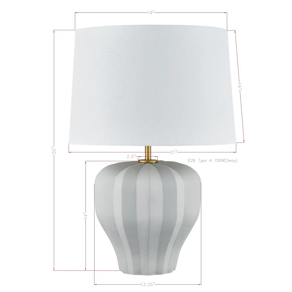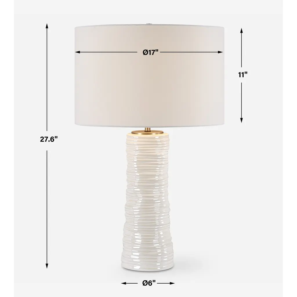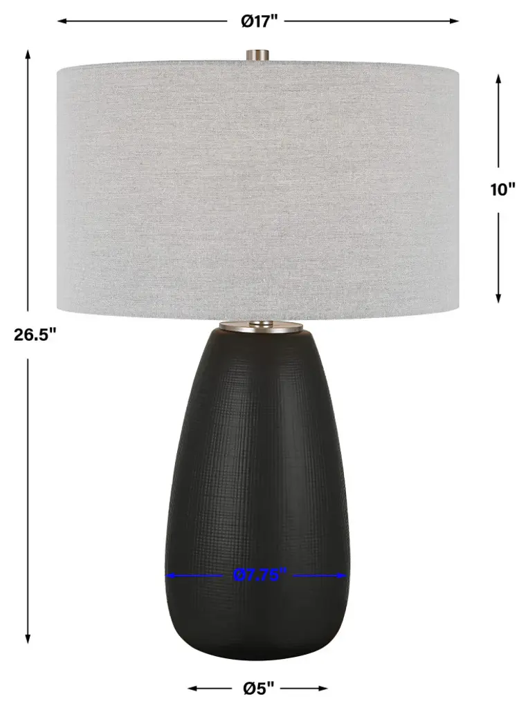 Uttermost's lamps combine premium quality materials with unique high-style design. With the advanced product engineering and packaging reinforcement, uttermost maintains some of the lowest damage rates in the industry. Each product is designed, manufactured and packaged with shipping in mind. This ceramic table lamp features eye-catching, crudely carved, cobalt glazed stripes with contrasting ivory, accented with brushed nickel details. The round hardback shade is covered in a white fabric. Features: Set includes: One (1) table lamp Materials: Ceramic, iron, fabric Finish: Ivory, cobalt, nickel Shade color: White Designer: Carolyn Kinder Shade: Round hardback drum Wattage: 150W Bulb quantity: 1 Bulb type: TYPE A Socket type: 3-WAY Voltage: 110 V Dimensions: Table lamp: 27.5 inches high x 16 inches wide x 16 inches deep Shade: 10 inches high x (16 x 16) inches top x (16 x 16) inches bottom This product will ship to you in one (1) box. WARNING: This product can expose you to chemicals including nickel which is known to the State of California to cause cancer. For more information, go to www.P65Warnings.ca.gov/furniture.